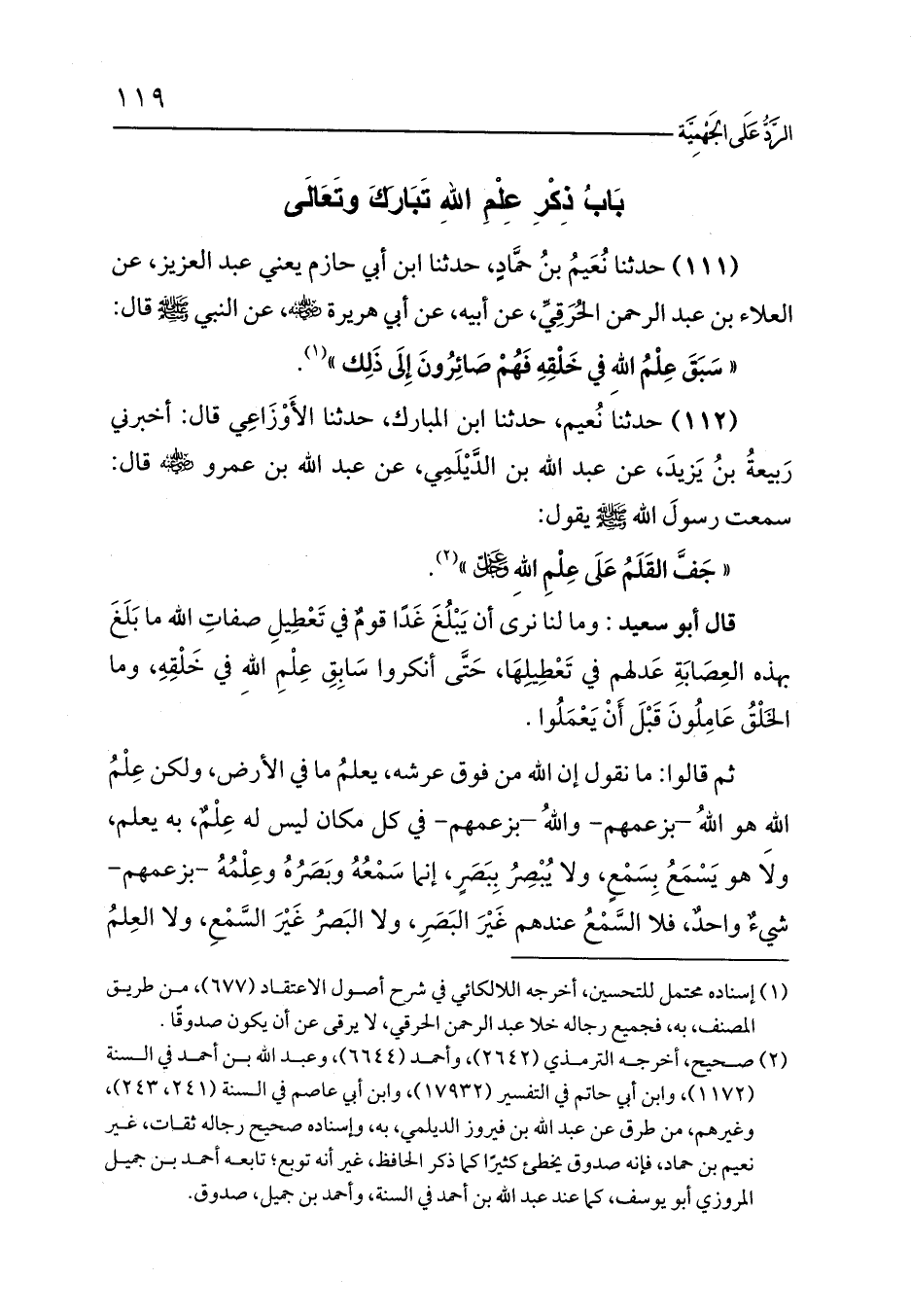 قال أبو سعيد: وما لنا نرى أن يَبْلُغَ غَدًا قومٌ في تَعْطِيلِ صفاتِ الله ما بَلَغَ بهذه العِصَابَةِ عَدلهم في تَعْطِيلِهَا، حَتَّى أنكروا سَابِقِ عِلْمِ اللهِ في خَلْقِهِ، وما الخَلْقُ عَامِلُونَ قَبْلَ أَنْ يَعْمَلُوا.