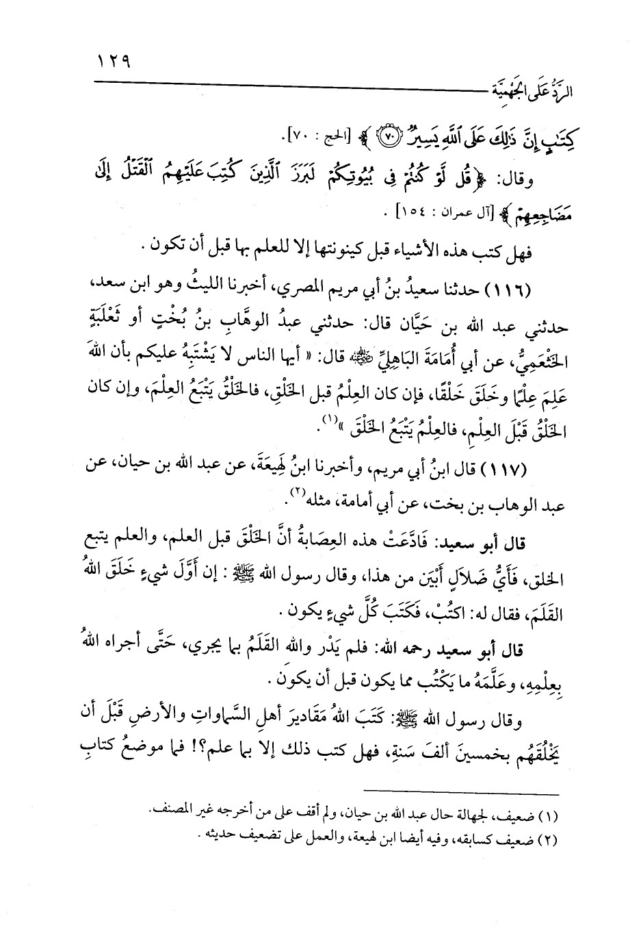 (116) حدثنا سعيدُ بنُ أبي مريم المصري، أخبرنا الليثُ وهو ابن سعد، حدثني عبد الله بن حَيَّان قال: حدثني عبدُ الوهَّابِ بنُ بُخْتٍ أو ثَعْلَبَةٍ الخَثْعَمِيُّ، عن أبي أُمَامَةَ البَاهِلِيِّ - رضي الله عنه - قال: «أيها الناس لا يَشْتَبِهُ عليكم بأن اللهَ عَلِمَ عِلْمًا وخَلَقَ خَلْقًا، فإن كان العِلْمُ قبل الخَلْقِ، فالخَلْقُ يَتْبَعُ العِلْمَ، وإن كان الخَلْقُ قَبْلَ العِلْمِ، فالعِلْمُ يَتْبَعُ الخَلْقَ» (¬1).