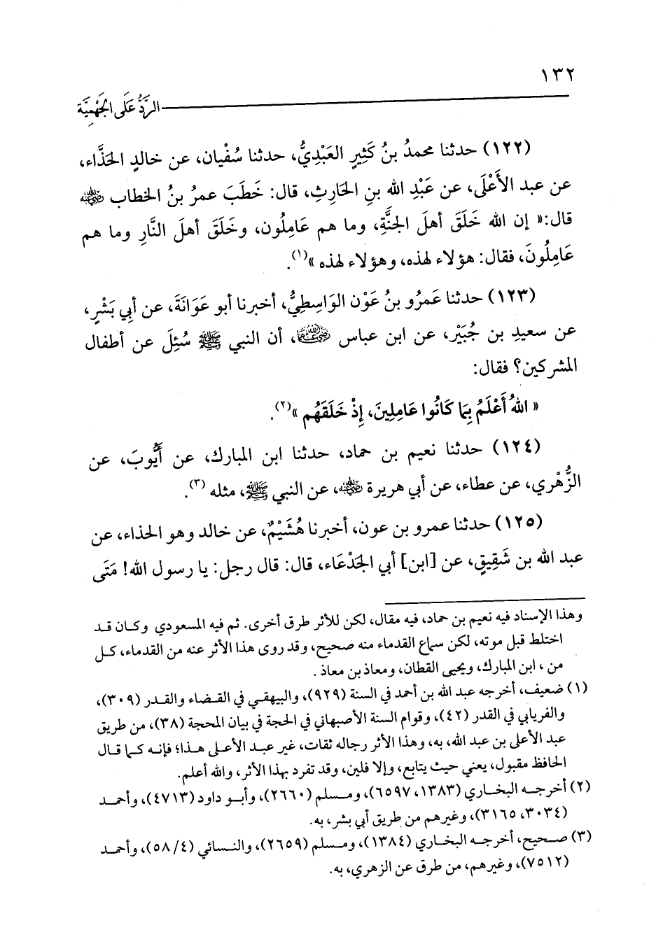 (122) حدثنا محمدُ بنُ كَثِيرٍ العَبْدِيُّ، حدثنا سُفْيان، عن خالدٍ الحَذَّاء، عن عبد الأَعْلَى، عن عَبْدِ اللهِ بنِ الحَارِثِ، قال: خَطَبَ عمرُ بنُ الخطاب - رضي الله عنه - قال: «إن الله خَلَقَ أهلَ الجنَّةِ، وما هم عَامِلُون، وخَلَقَ أهلَ النَّارِ وما هم عَامِلُونَ، فقال: هؤلاء لهذه، وهؤلاء لهذه» (¬1).