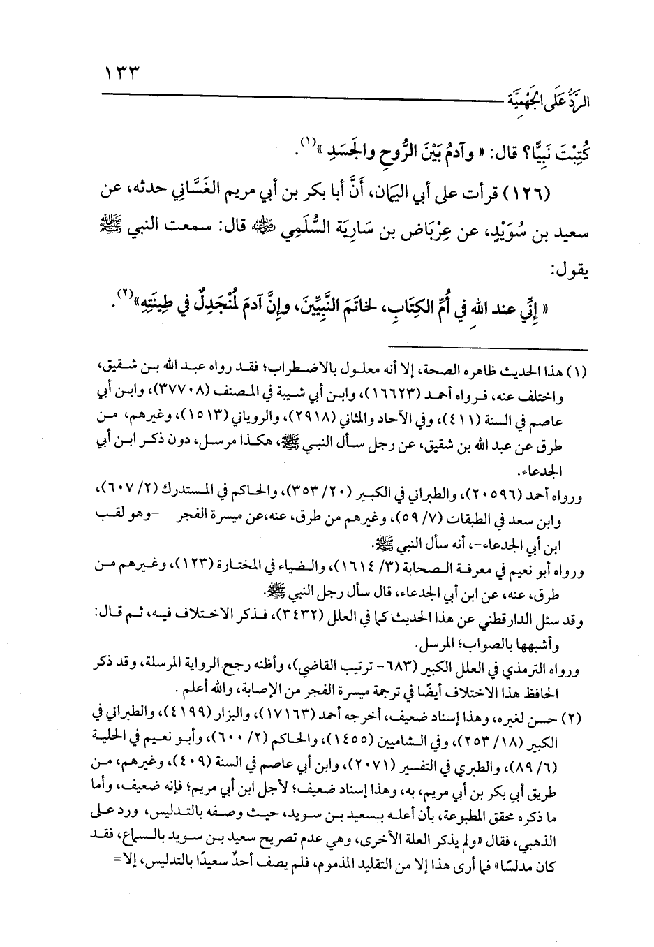 (126) قرأت على أبي اليَمَان، أَنَّ أبا بكر بن أبي مريم الغَسَّانِي حدثه، عن سعيد بن سُوَيْدٍ، عن عِرْبَاض بن سَارِيَة السُّلَمِي - رضي الله عنه - قال: سمعت النبي - صلى الله عليه وسلم - يقول: