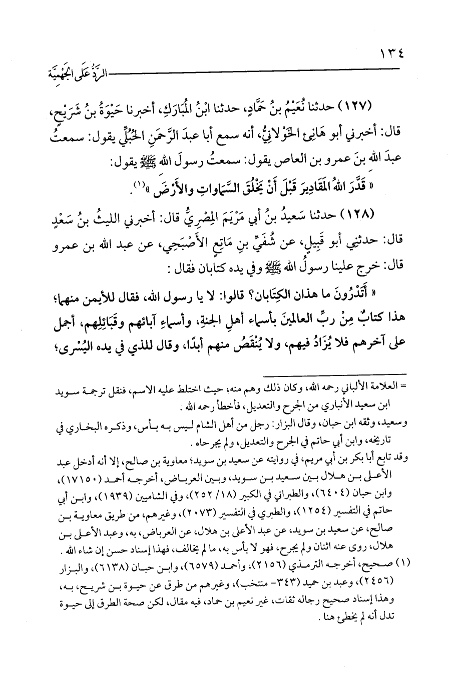 (128) حدثنا سَعيدُ بنُ أبي مَرْيَمَ المِصْرِيُّ قال: أخبرني الليثُ بنُ سَعْدٍ قال: حدثنِي أبو قَبِيلٍ، عن شُفَيِّ بنِ مَاتِعٍ الأَصْبَحِي، عن عبد الله بن عمرو قال: خرج علينا رسولُ الله - صلى الله عليه وسلم - وفي يده كتابان فقال: