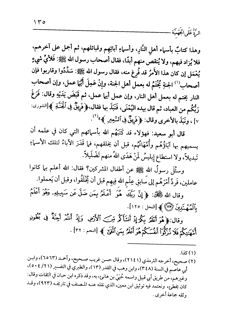 وسئُلَ رسولُ اللهِ - صلى الله عليه وسلم - عن أطفال المشركين؟ فقال: الله أعلم بما كانوا عاملين، فَردَّ أَمْرَهُم إلى سابقِ عِلْمِ اللهِ فِيهِم قبل أن يُخْلَقُوا، وقبل أن يَعملوا.