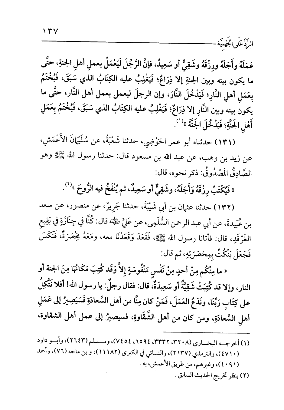 «ما مِنْكُم مِنْ أحدٍ مِنْ نَفْسٍ مَنْفُوسَةٍ إِلاَّ وَقَد كُتِبَ مَكَانُهَا مِنَ الجنة أو النار، وإلا قد كُتِبَتْ شَقِيَّةٌ أو سَعِيدَةٌ، قال: فقال رجلٌ: يا رسول الله! أفلا نَتَّكِلُ على كِتَابِ رَبِّنَا، ونَدَعُ العَمَلَ، فَمَنْ كان مِنَّا من أهل السَّعادَةِ فَسَيَصِيرُ إلى عَمَلِ أهلِ السَّعادَةِ، ومن كان من أهل الشَّقَاوةِ، فسيصيرُ إلى عمل أهل الشقاوة،