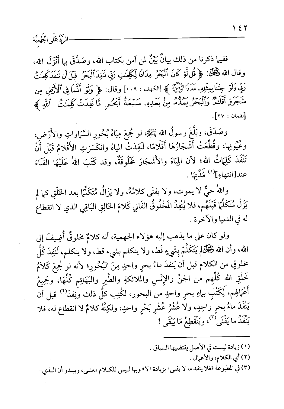 ولو كان على ما يذهب إليه هؤلاء الجهمية، أنه كلامٌ مخلوقٌ أُضِيفَ إلى الله، وأن الله - عز وجل - لم يَتَكَلَّمْ بِشَيءٍ قَط، ولا يتكلم بشيء قط، ولا يتكلم، لَنَفِدَ كُلُّ مخلوقٍ من الكلام قبل أن يَنفدَ ماءُ بحرٍ واحدٍ مِنَ البُحُورِ؛ لأنه لو جُمِعَ كَلاَمُ خَلْقِ اللهِ كُلِّهِم من الجنِّ والإِنْسِ والملائكةِ والطَّيرِ والبَهَائِمِ كُلِّهَا، وجَمِيعُ أَعْمَالِهِم، لِكَتْبٍ بماءِ بحرٍ واحدٍ من البحور، لكُتِب كلُّ ذلك ونِفدَ (¬2) قبل أن يَنْفَدَ ماءُ بحرٍ واحِدٍ، ولا عُشْرُ عُشْرِ بَحْرٍ واحدٍ، ولكِنَّهُ كلامٌ لا انقطاع له، فلا يَنْفَدُ ما يَفْنَى (¬3)، ويَنْقَطِعُ مَا يَبْقَى!