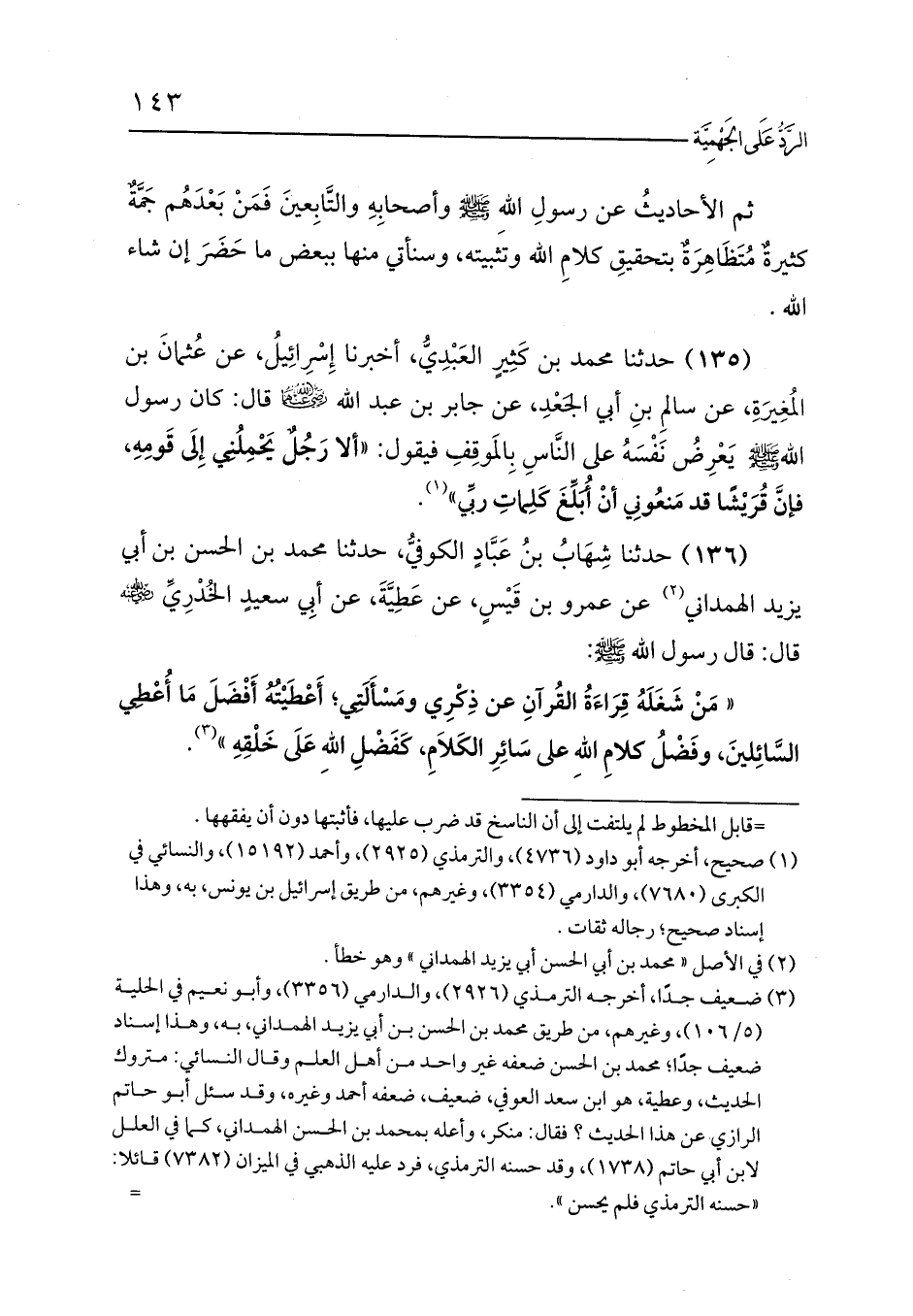 (135) حدثنا محمد بن كَثِيرٍ العَبْدِيُّ، أخبرنا إِسْرِائِيلُ، عن عُثمانَ بن المُغِيرَةِ، عن سالمِ بنِ أبي الجَعْدِ، عن جابر بن عبد الله ? قال: كان رسول الله - صلى الله عليه وسلم - يَعْرِضُ نَفْسَهُ على النَّاسِ بِالمَوقِفِ فيقول: «ألا رَجُلٌ يَحْمِلُنِي إِلَى قَومِهِ، فإنَّ قُرَيْشًا قد مَنعُونِي أنْ أُبَلِّغَ كَلِماتِ ربِّي» (¬1).