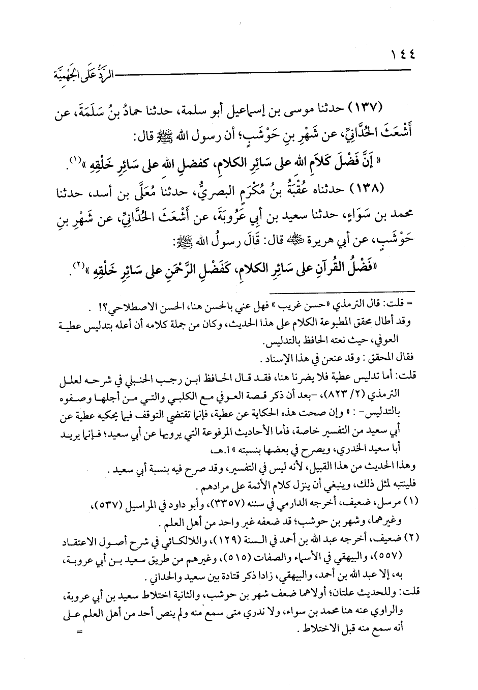(138) حدثناه عُقْبَةُ بنُ مُكْرَمٍ البصريُّ، حدثنا مُعَلَّى بن أسد، حدثنا محمد بن سَوَاءٍ، حدثنا سعيد بن أبِي عَرُوبَةَ، عن أَشْعَثَ الحُدَّانِيِّ، عن شَهْرِ بنِ حَوْشَبٍ، عن أبي هريرة - رضي الله عنه - قال: قَالَ رسولُ الله - صلى الله عليه وسلم -: