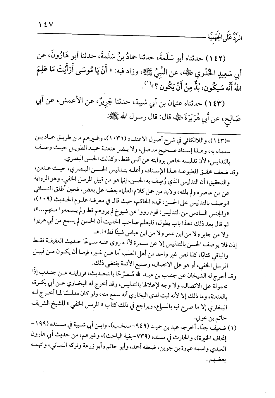 (142) حدثناه أبو سَلَمةَ، حدثنا حمادُ بنُ سَلَمةَ، حدثنا أبو هَارُونَ، عن أبي سَعِيدٍ الخُدْري - رضي الله عنه -، عن النَّبِيِّ - صلى الله عليه وسلم -، وزاد فيه: «أَنْ يَا مُوسَى أَرَأَيْتَ مَا عَلِمَ اللهُ أَنَّه سَيكُون، بُدٌّ مِنْ أَنْ يَكُون؟» (¬1).