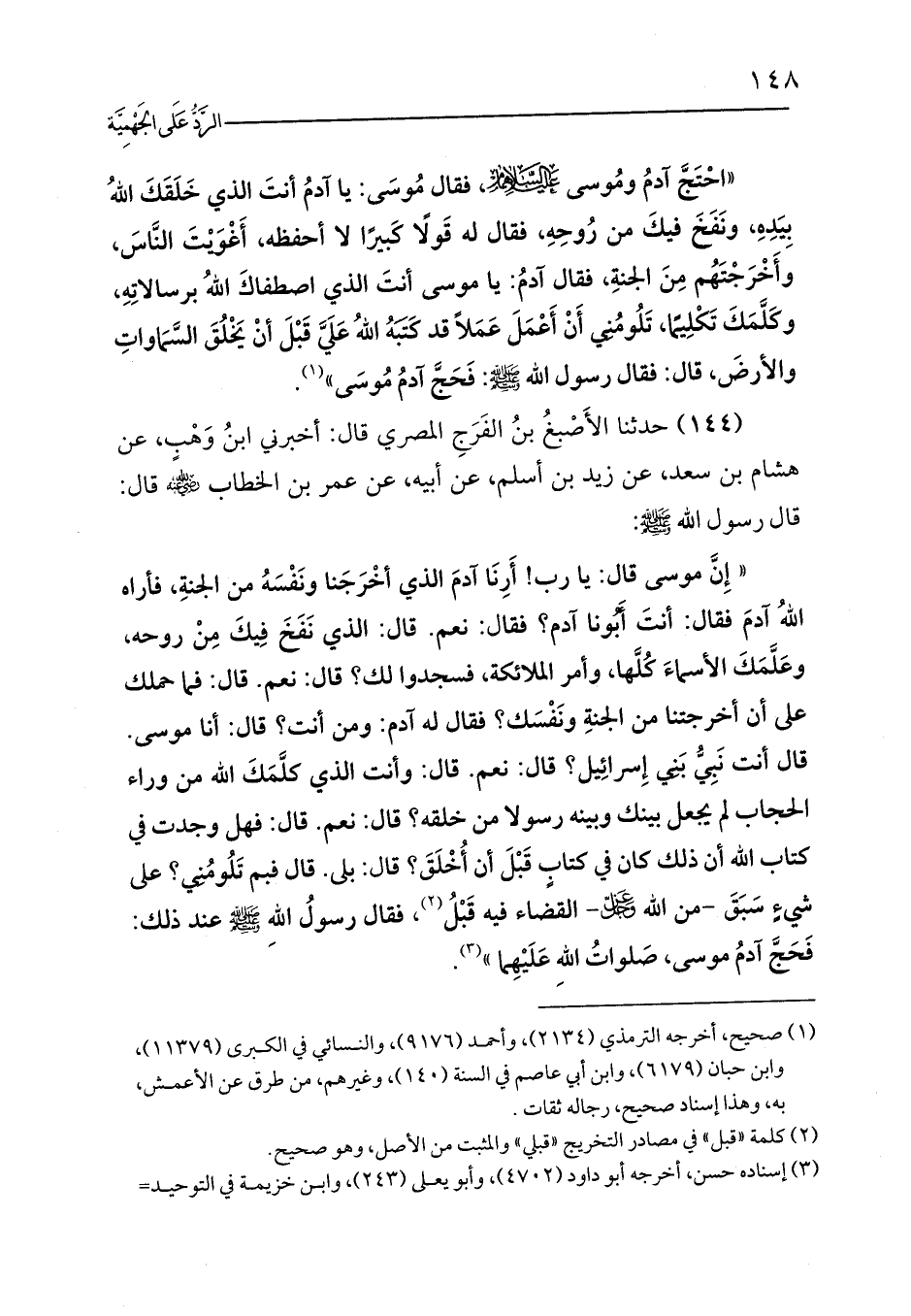 «احْتَجَّ آدمُ ومُوسى - عليه السلام -، فقال مُوسَى: يا آدمُ أنتَ الذي خَلَقَكَ اللهُ بِيَدِهِ، ونَفَخَ فيكَ من رُوحِهِ، فقال له قَولًا كَبيرًا لا أحفظه، أَغْوَيْتَ النَّاسَ، وأَخْرَجْتَهُم مِنَ الجنةِ، فقال آدمُ: يا موسى أنتَ الذي اصطفاكَ اللهُ برسالاتِهِ، وكَلَّمَكَ تَكْلِيمًا، تَلُومُنِي أَنْ أَعْمَلَ عَمَلاً قد كَتَبَهُ اللهُ عَلَيَّ قَبْلَ أنْ يَخْلُقَ السَّمَاواتِ والأرضَ، قال: فقال رسول الله - صلى الله عليه وسلم -: فَحَجَّ آدمُ مُوسَى» (¬1).