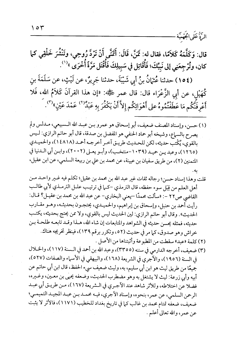 (154) حدثنا عُثمَانُ بنُ أبِي شَيْبَةَ، حدثنا جَرِيرٌ، عن لَيْثٍ، عن سَلَمَةَ بنِ كُهَيْلٍ، عن أبِي الزَّعْرَاء قال: قال عمر - رضي الله عنه -: «إن هذا القرآنَ كَلاَمُ اللهِ، فَلا أَعْرِفَنَّكُم مَا عَطَفْتُمُوهُ على أَهْوَائِكُم إِلاَّ أَنْ يَكْفُرَ بِهِ عَبْدٌ (¬2) عَمْدَ عَيْنٍ» (¬3).