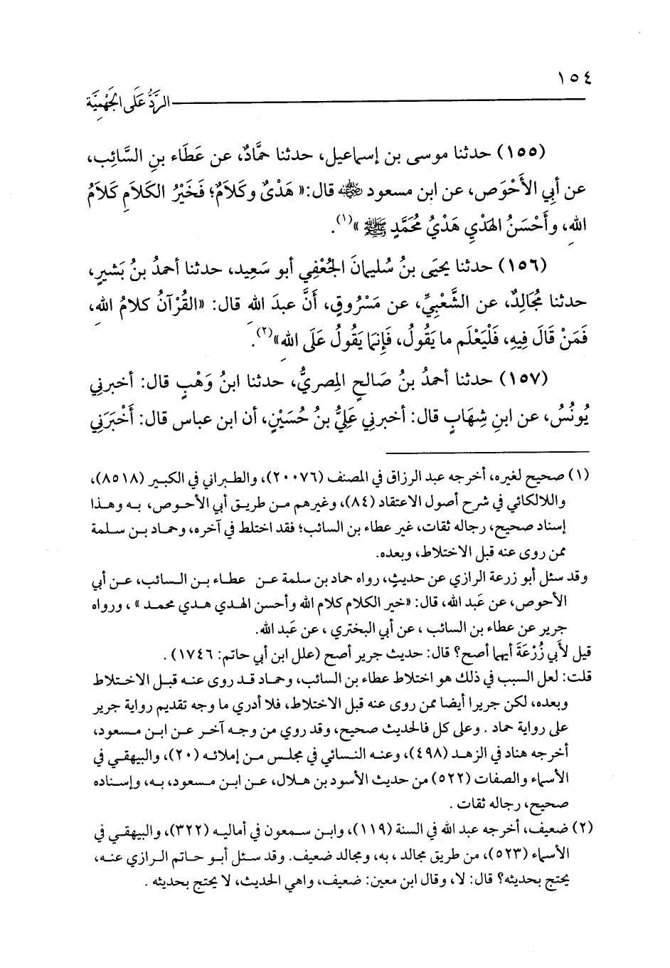 (155) حدثنا موسى بن إسماعيل، حدثنا حمَّادٌ، عن عَطَاء بنِ السَّائِب، عن أبِي الأَحْوَص، عن ابن مسعود - رضي الله عنه - قال: «هَدْىٌ وكَلاَمٌ؛ فَخَيْرُ الكَلاَمِ كَلاَمُ اللهِ، وأَحْسَنُ الهَدْيِ هَدْيُ مُحَمَّدٍ - صلى الله عليه وسلم -» (¬1).