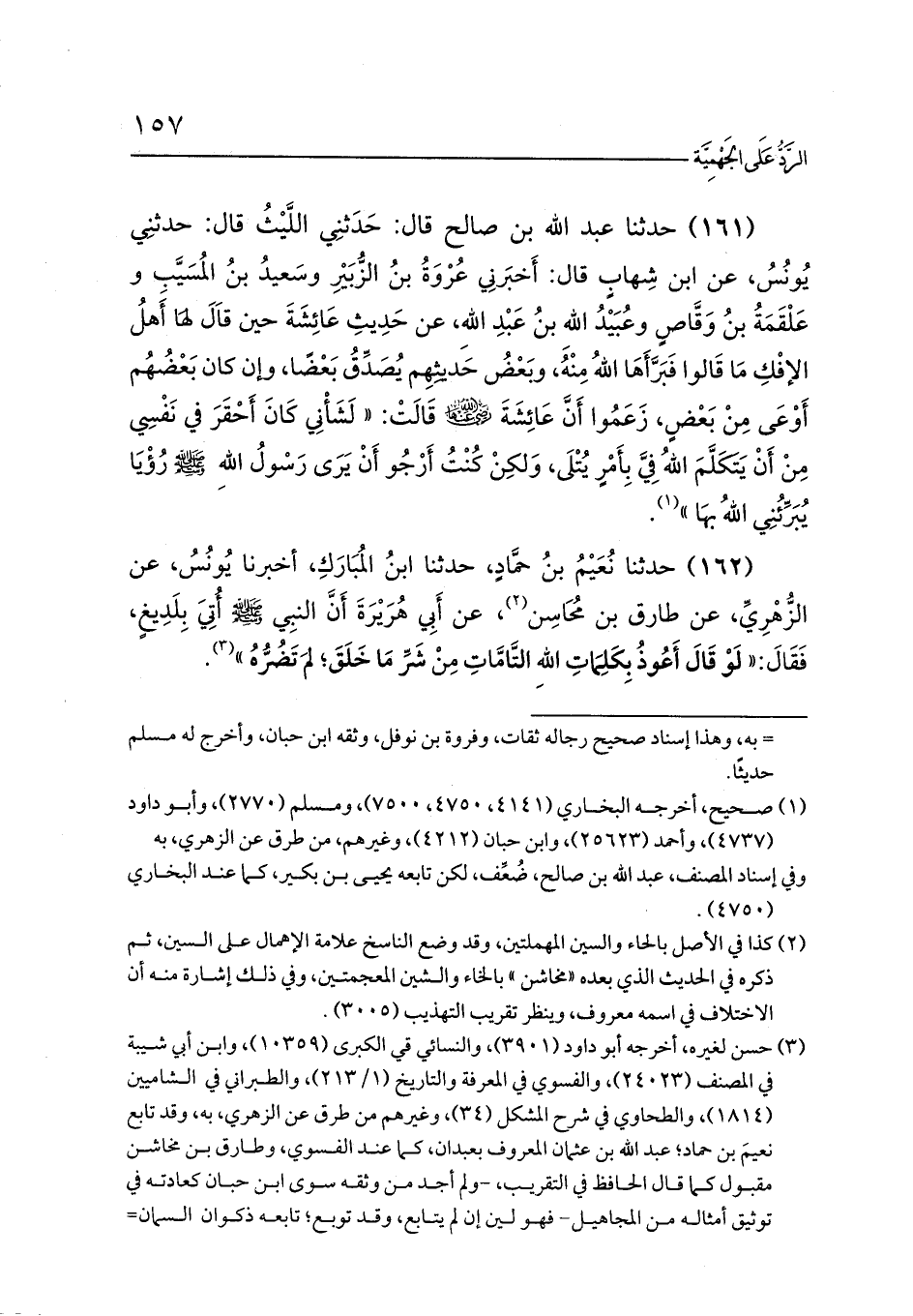 (161) حدثنا عبد الله بن صالح قال: حَدَثنِي اللَّيْثُ قال: حدثنِي يُونُسُ، عن ابن شِهابٍ قال: أَخبَرنِي عُرْوَةُ بنُ الزُّبَيْرِ وسَعيدُ بنُ المُسَيَّبِ وعَلْقَمَةُ بنُ وَقَّاصٍ وعُبَيْدُ اللهِ بنُ عَبْدِ اللهِ، عن حَدِيثِ عَائِشَةَ حين قاَلَ لهَا أَهلُ الإفْكِ مَا قَالوا فَبَرَّأَهَا اللهُ مِنْهُ، وبَعْضُ حَديثِهِم يُصَدِّقُ بَعْضًا، وإن كان بَعْضُهُم أَوْعَى مِنْ بَعْضٍ، زَعَمُوا أَنَّ عَائِشَةَ - رضي الله عنها - قَالَتْ: «لَشَأْنِي كَانَ أَحْقَرَ في نَفْسِي مِنْ أَنْ يَتَكَلَّمَ اللهُ فِيَّ بِأَمْرٍ يُتْلَى، وَلكِنْ كُنْتُ أَرْجُو أَنْ يَرَى رَسْولُ اللهِ - صلى الله عليه وسلم - رُؤْيَا يُبَرِّئُنِي اللهُ بهَا» (¬1).