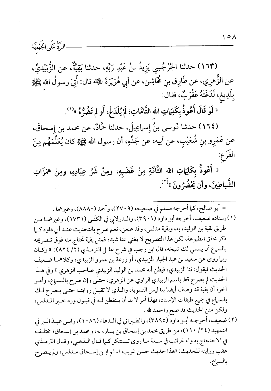 (163) حدثنا الجُرْجُسِي يَزِيدُ بنُ عَبْدِ رَبِّهِ، حدثنا بَقِيَّةٌ، عن الزُّبَيْدِيِّ، عن الزُّهرِي، عن طَارِق بنِ مُخَاشِن، عن أبِي هُرَيْرَةَ - رضي الله عنه - قال: أُتِيَ رسولُ اللهِ - صلى الله عليه وسلم - بِلَدِيغٍ، لَدَغَتْهُ عَقْرَبٌ، فقال: