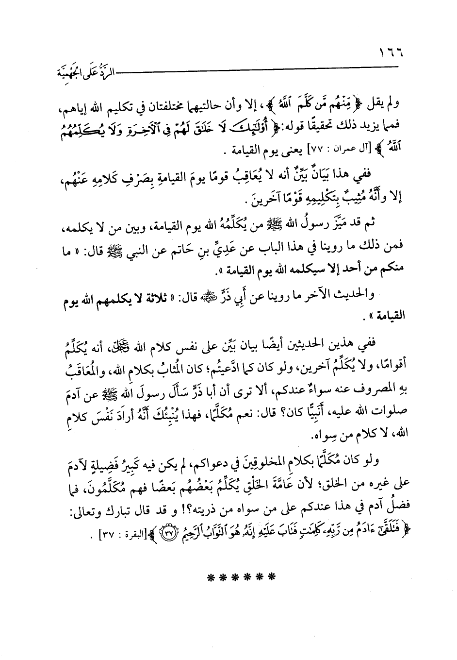 ففي هذين الحديثين أيضًا بيان بَيِّن على نفس كلام الله - عز وجل -، أنه يُكَلِّمُ أقوامًا، ولا يُكَلِّمُ آخرين، ولو كان كما ادَّعيتُم؛ كان المُثابُ بكلامِ الله، والمُعَاقَبُ بهِ المصروف عنه سواءٌ عندكم، ألا ترى أن أبا ذَرٍّ سَأَلَ رسولَ اللهِ - صلى الله عليه وسلم - عن آدمَ صلوات الله عليه، أَنَبِيًّا كان؟ قال: نعم مُكَلَّمًا، فهذا يُنْبِئُكَ أَنَّهُ أرادَ نَفْسَ كلامِ الله، لا كلام من سِواه.