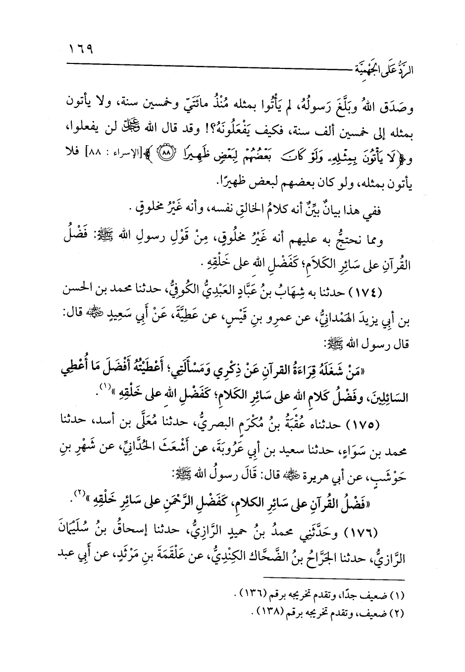 ومما نحتجُّ به عليهم أنه غَيْرُ مخلُوقٍ، مِنْ قَوْلِ رسولِ الله - صلى الله عليه وسلم -: فَضْلُ القُرآنِ على سَائِرِ الكَلاَمِ؛ كَفَضْلِ اللهِ على خَلْقِهِ.
