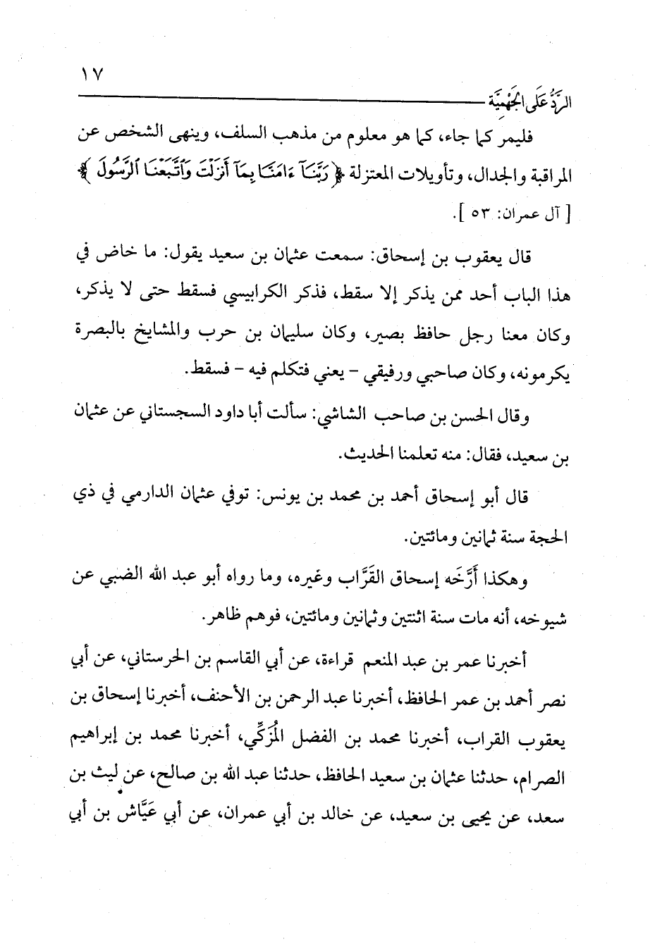 أخبرنا عمر بن عبد المنعم قراءة، عن أبي القاسم بن الحرستاني، عن أبي نصر أحمد بن عمر الحافظ، أخبرنا عبد الرحمن بن الأحنف، أخبرنا إسحاق بن يعقوب القراب، أخبرنا محمد بن الفضل المُزَكِّي، أخبرنا محمد بن إبراهيم الصرام، حدثنا عثمان بن سعيد الحافظ، حدثنا عبد الله بن صالح، عن ليث بن سعد، عن يحيى بن سعيد، عن خالد بن أبي عمران، عن أبي عَيَّاش بن أبي