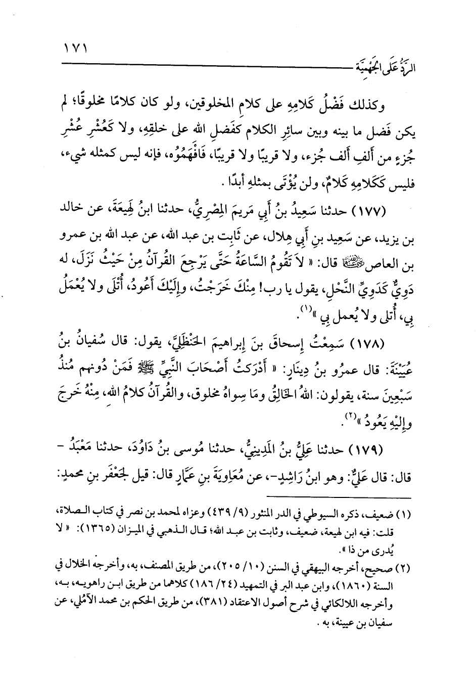 (178) سَمِعْتُ إِسحاقَ بنَ إِبراهيمَ الحَنْظَلِيَّ، يقول: قال سُفيانُ بنُ عُيَيْنَةَ: قال عمرُو بنُ دِينَارٍ: «أَدْرَكتُ أَصْحَابَ النَّبِيِّ - صلى الله عليه وسلم - فَمَنْ دُونهم مُنذُ سَبْعِينَ سنة، يقولون: اللهُ الخَالِقُ ومَا سِواهُ مخلوق، والقُرآنُ كلامُ اللهِ، مِنْهُ خَرجَ وإِليْهِ يَعُودُ» (¬2).