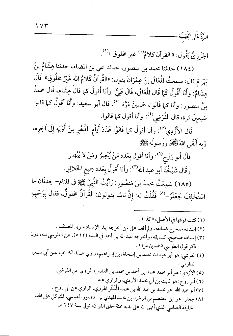(184) حدثنا محمد بن منصور، حدثنا علي بن المضاء، حدثنا هِشَامُ بنُ بَهْرَامَ قال: سمعتُ المُعَافَى بنَ عِمْرَانَ يقول: «القُرآنُ كَلامُ اللهِ غَيْرُ مخلُوقٍ» قَالَ هِشَامٌ: وأَنَا أَقُولُ كَمَا قَال المُعَافَى، قَالَ عَلِيٌّ: وأنا أَقولُ كما قال هِشَام، قَال محمدُ بنُ منصور: وأنا كما قَالوا، خمسينَ مَرَّة (¬3). قال أبو سعيد: وأَنَا أقولُ كما قالوا سَبعيِنَ مَرة، قال القُرَشِي (¬4): وأنا أقول كما قالوا.