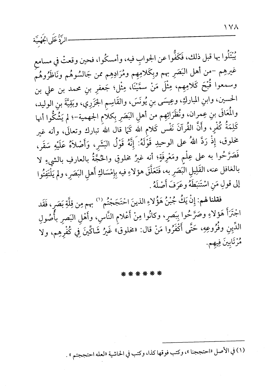 يُبْتَلُوا بها قبل ذلك، فَكَفُّوا عن الجوابِ فيه، وأمسكُوا، فحين وقعتْ في مسامعِ غيرهِم -من أهل البَصَرِ بهم وبِكَلامِهِم ومُرَادِهِم ممن جَالسُوهُم ونَاظَرُوهُم وسمعوا قُبْحَ كَلامِهِم، مِثْلَ مَنْ سمَّيْنَا، مِثْل؛ جَعفرِ بنِ محمد بن علي بن الحسين، وابنِ المباركِ، وعِيسَى بنِ يُونَسَ، والقَاسِمِ الجَزَرِي، وبَقِيَّةَ بنِ الوليد، والمُعَافَى بنِ عِمران، ونُظَرَائِهِم من أهلِ البَصَرِ بِكلامِ الجهمية-؛ لم يَشُكُّوا أنها كَلِمَةُ كُفْرٍ، وأَنَّ القُرآنَ نَفْس كَلامِ اللهِ كَمَا قال الله تبارك وتعالَى، وأنه غير مخلوق، إِذْ رَدَّ اللهُ على الوحيدِ قَوْلَهُ: إِنَّهُ قَوْلُ البَشَرِ، وَأَصْلاَهُ عَلَيْهِ سَقَر، فَصَرَّحُوا به على عِلْمٍ ومَعْرِفَةٍ؛ أنه غيرُ مخلوقٍ والحُجَّةُ بالعارفِ بالشيءِ لا بالغافل عنه، القَلِيلِ البَصَرِ به، فَتَعَلَّقَ هؤلاءِ فيه بِإِمْسَاكِ أَهلِ البَصَرِ، ولم يَلْتَفِتُوا إلى قولِ مَنِ اسْتَنبَطَهُ وعَرَفَ أَصْلَهُ.