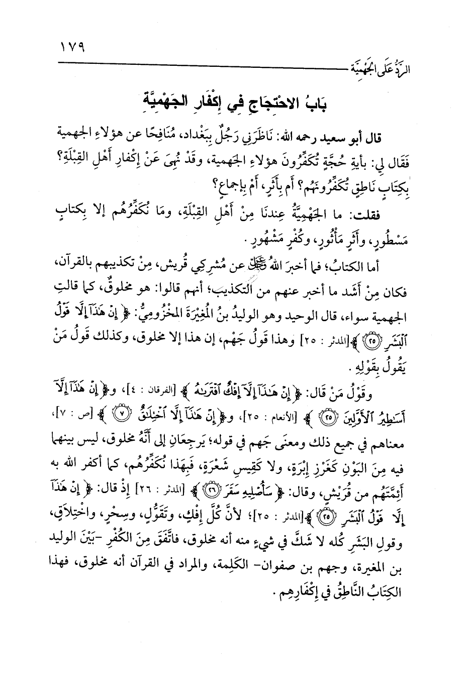 وقَوْلُ مَنْ قَال: {إِنْ هَذَا إِلَّا إِفْكٌ افْتَرَاهُ} [الفرقان: 4]، و {إِنْ هَذَا إِلَّا أَسَاطِيرُ الْأَوَّلِينَ (25)} [الأنعام: 25]، و {إِنْ هَذَا إِلَّا اخْتِلَاقٌ (7)} [ص: 7]، معناهم في جميع ذلك ومعنَى جَهم في قوله؛ يَرجِعَانِ إلى أَنَّهُ مخلوق، ليس بينهما فيه مِنَ البَوْنِ كَغَرْزِ إِبْرَةٍ، ولا كَقِيسِ شَعْرَةٍ، فَبِهَذا نُكَفِّرُهُم، كما أكفر الله به أَئِمَّتَهُم من قُرَيْشٍ، وقال: {سَأُصْلِيهِ سَقَرَ (26)} [المدثر: 26] إِذْ قال: {إِنْ هَذَا إِلَّا قَوْلُ الْبَشَرِ (25)} [المدثر: 25]؛ لأنَّ كُلَّ إِفْكٍ، وتَقَوُّلٍ، وسِحْرٍ، واخْتِلاَقٍ، وقولِ البَشَرِ كُله لا شَكَّ في شيءٍ منه أنه مخلوق، فاتَّفَقَ مِنَ الكُفْرِ -بَيْنَ الوليد بن المغيرة، وجهم بن صفوان- الكَلِمة، والمراد في القرآن أنه مخلوق، فهذا الكِتَابُ النَّاطِقُ في إِكْفَارِهِم.