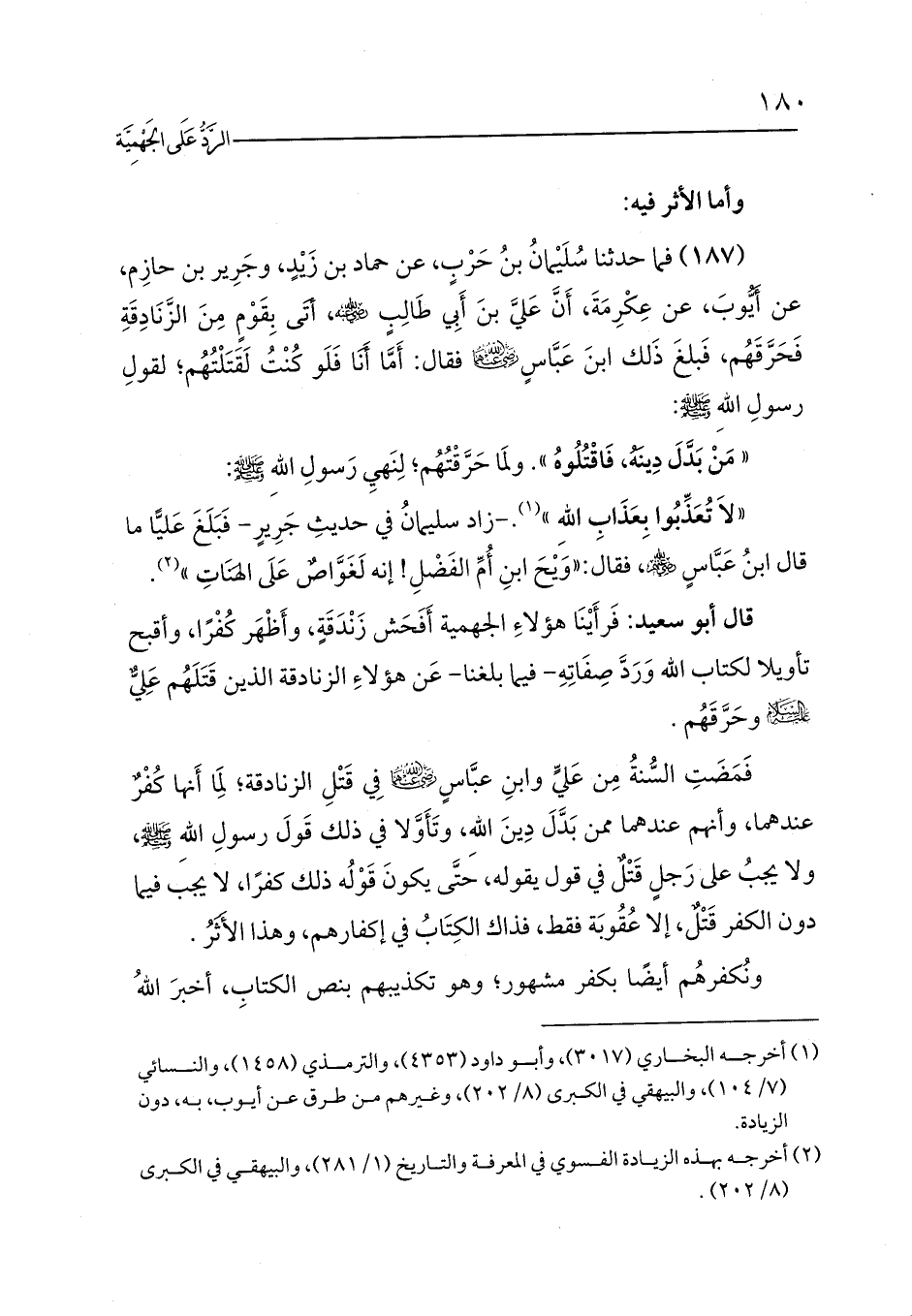 (187) فما حدثنا سُلَيْمانُ بنُ حَرْبٍ، عن حماد بن زَيْدٍ، وجَرِير بن حازِم، عن أَيُّوبَ، عن عِكْرِمَةَ، أَنَّ عَليَّ بنَ أَبِي طَالِبٍ - رضي الله عنه -، أتَى بِقَوْمٍ مِنَ الزَّنَادِقَةِ فَحَرَّقَهُم، فَبلغَ ذَلك ابنَ عَبَّاسٍ? فقال: أَمَّا أَنَا فَلَو كُنْتُ لَقَتَلْتُهُم؛ لقولِ رسولِ اللهِ - صلى الله عليه وسلم -: