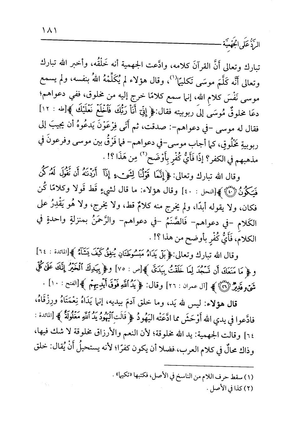وقال الله تبارك وتعالى: {إِنَّمَا قَوْلُنَا لِشَيْءٍ إِذَا أَرَدْنَاهُ أَنْ نَقُولَ لَهُ كُنْ فَيَكُونُ (40)} [النحل: 40] وقال هؤلاء: ما قال لشيءٍ قَط قَولا وكلامًا كُن فكان، ولا يقوله أبدًا، ولم يخرج منه كلامٌ قط، ولا يخرج، ولا هُو يَقْدِرُ على الكَلامِ -في دعواهم- فَالصَّنَمُ -في دعواهم- والرَّحمَنُ بمنزلةٍ واحدةٍ في الكلام، فَأَيُّ كُفْرٍ بأوضح من هذا؟!.