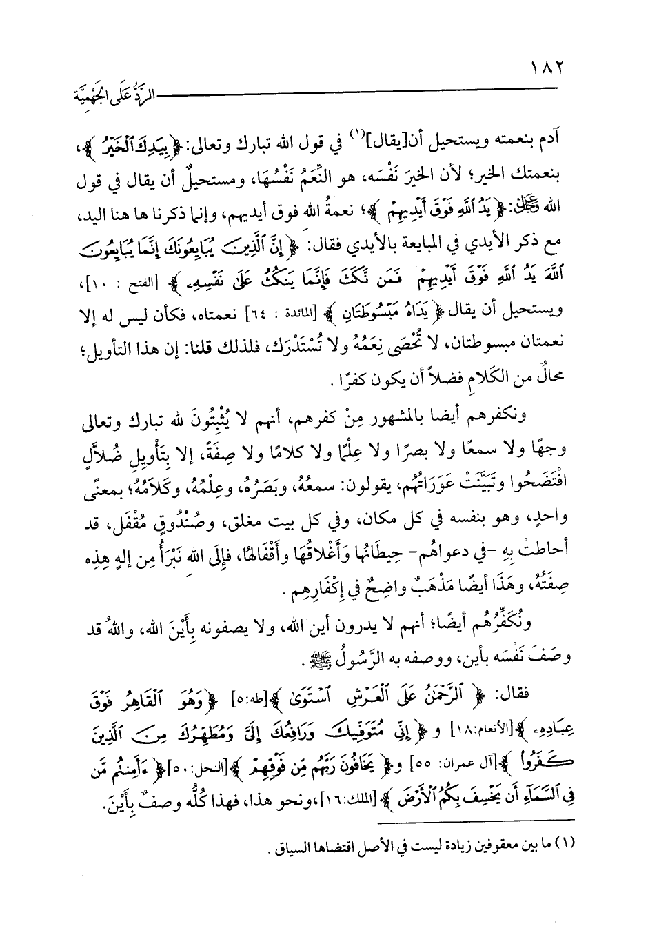 فقال: {الرَّحْمَنُ عَلَى الْعَرْشِ اسْتَوَى} [طه:5] {وَهُوَ الْقَاهِرُ فَوْقَ عِبَادِهِ} [الأنعام:18] و {إِنِّي مُتَوَفِّيكَ وَرَافِعُكَ إِلَيَّ وَمُطَهِّرُكَ مِنَ الَّذِينَ كَفَرُوا} [آل عمران: 55] و {يَخَافُونَ رَبَّهُمْ مِنْ فَوْقِهِمْ} [النحل:50] {أَأَمِنْتُمْ مَنْ فِي السَّمَاءِ أَنْ يَخْسِفَ بِكُمُ الْأَرْضَ} [الملك:16]،ونحو هذا، فهذا كُلُّه وصفٌ بِأَيْنَ.