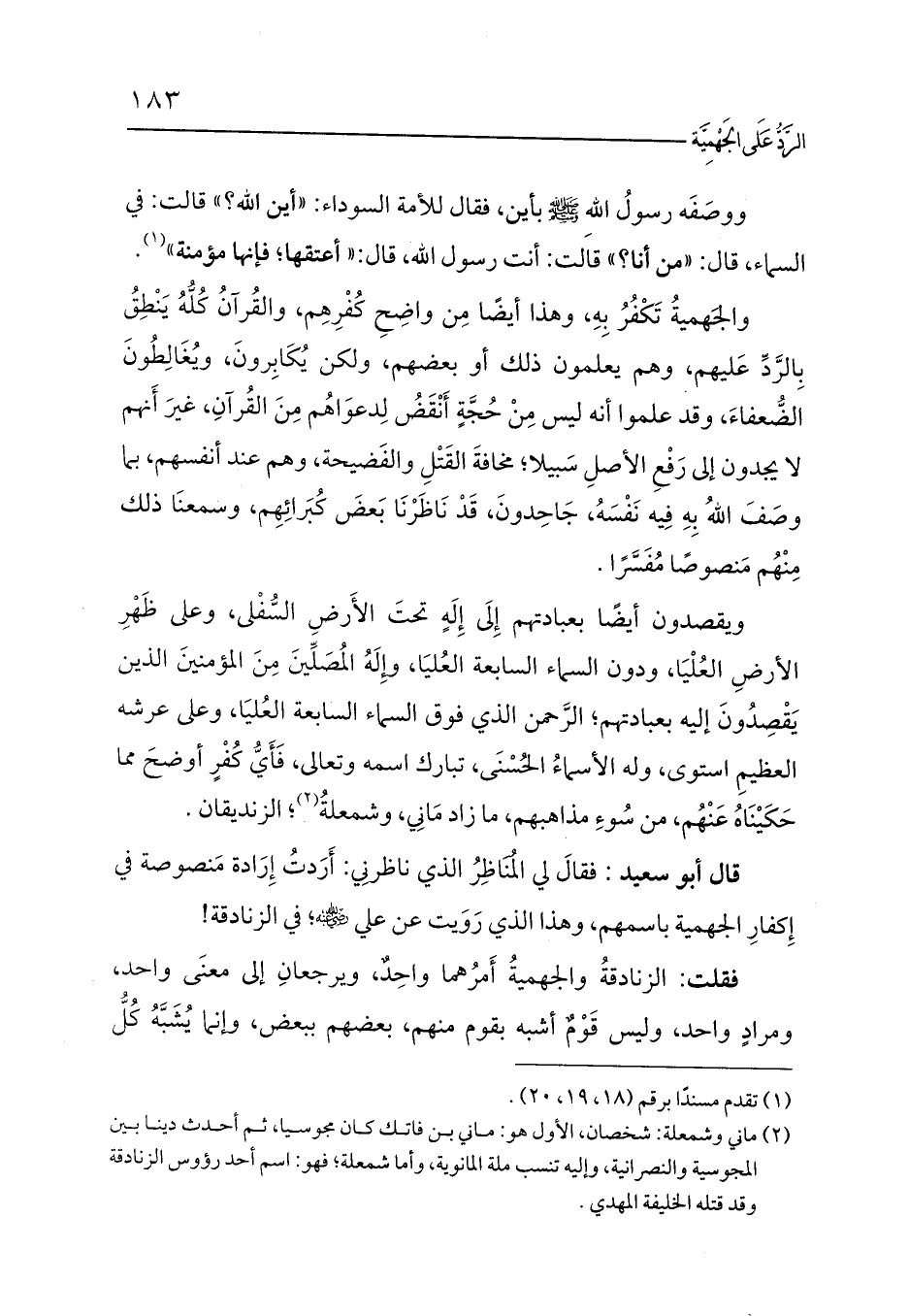 قال أبو سعيد: فقالَ لي المُنَاظِرُ الذي ناظرنِي: أَرَدتُ إِرَادة مَنصوصة في إِكفارِ الجهمية باسمهم، وهذا الذي رَوَيت عن علي - رضي الله عنه -؛ في الزنادقة!