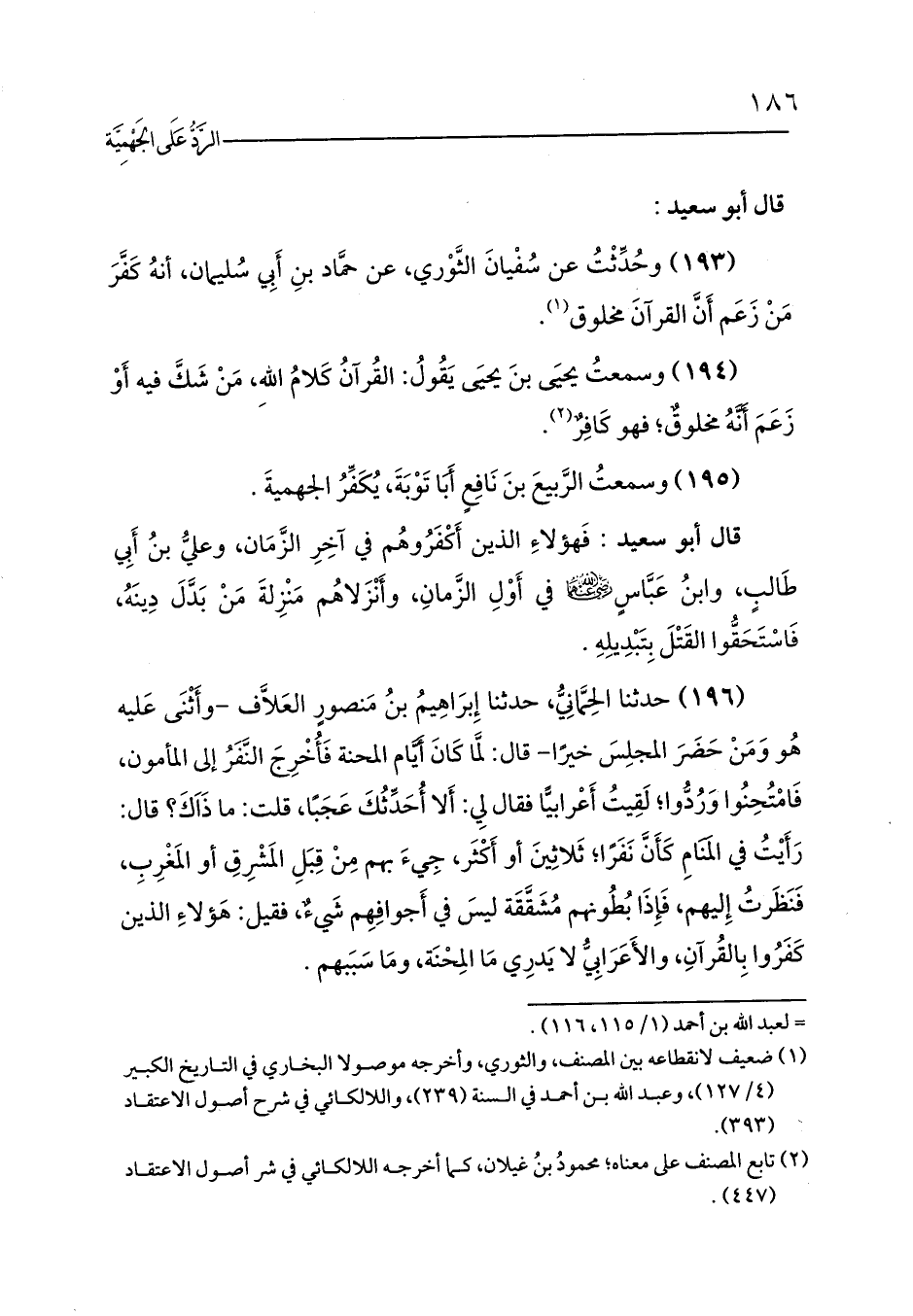 (193) وحُدِّثْتُ عن سُفْيانَ الثَّوْري، عن حمَّاد بنِ أَبِي سُليمان، أنهُ كَفَّرَ مَنْ زَعَم أَنَّ القرآنَ مخلوق (¬1).