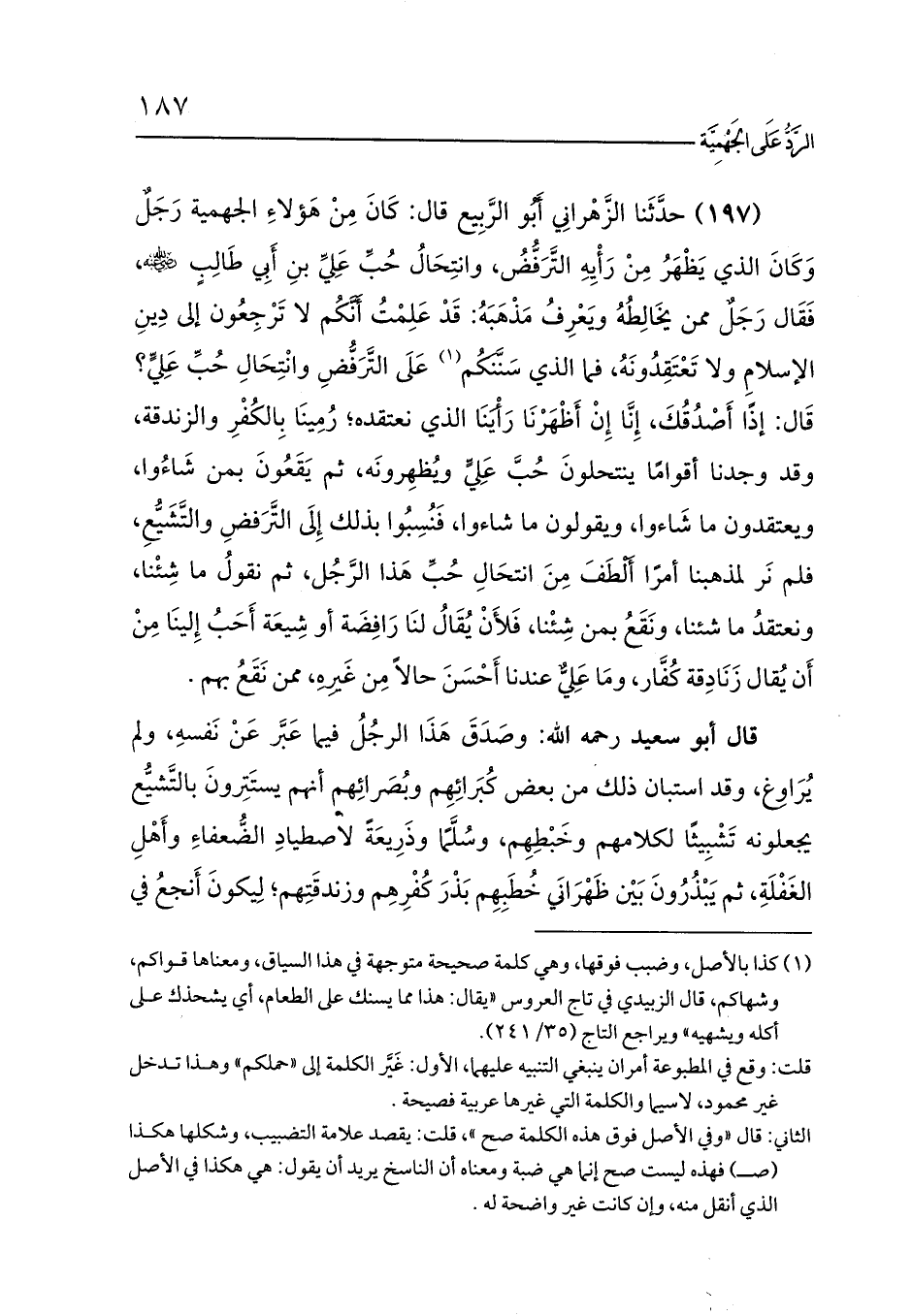 (197) حدَّثَنا الزَّهْرانِي أَبُو الرَّبِيع قال: كَانَ مِنْ هَؤلاءِ الجهمية رَجَلٌ وَكَانَ الذي يَظْهَرُ مِنْ رَأْيِهِ التَّرَفُّضُ، وانتِحَالُ حُبِّ عَلِيِّ بنِ أَبِي طَالِبٍ - رضي الله عنه -، فَقَال رَجَلٌ ممن يخَالِطُهُ ويَعْرِفُ مَذْهَبَهُ: قَدْ عَلِمْتُ أَنَّكُم لا تَرْجِعُون إلى دِينِ الإسلامِ ولا تَعْتَقِدُونَهُ، فما الذي سَنَّنَكُم (¬1)