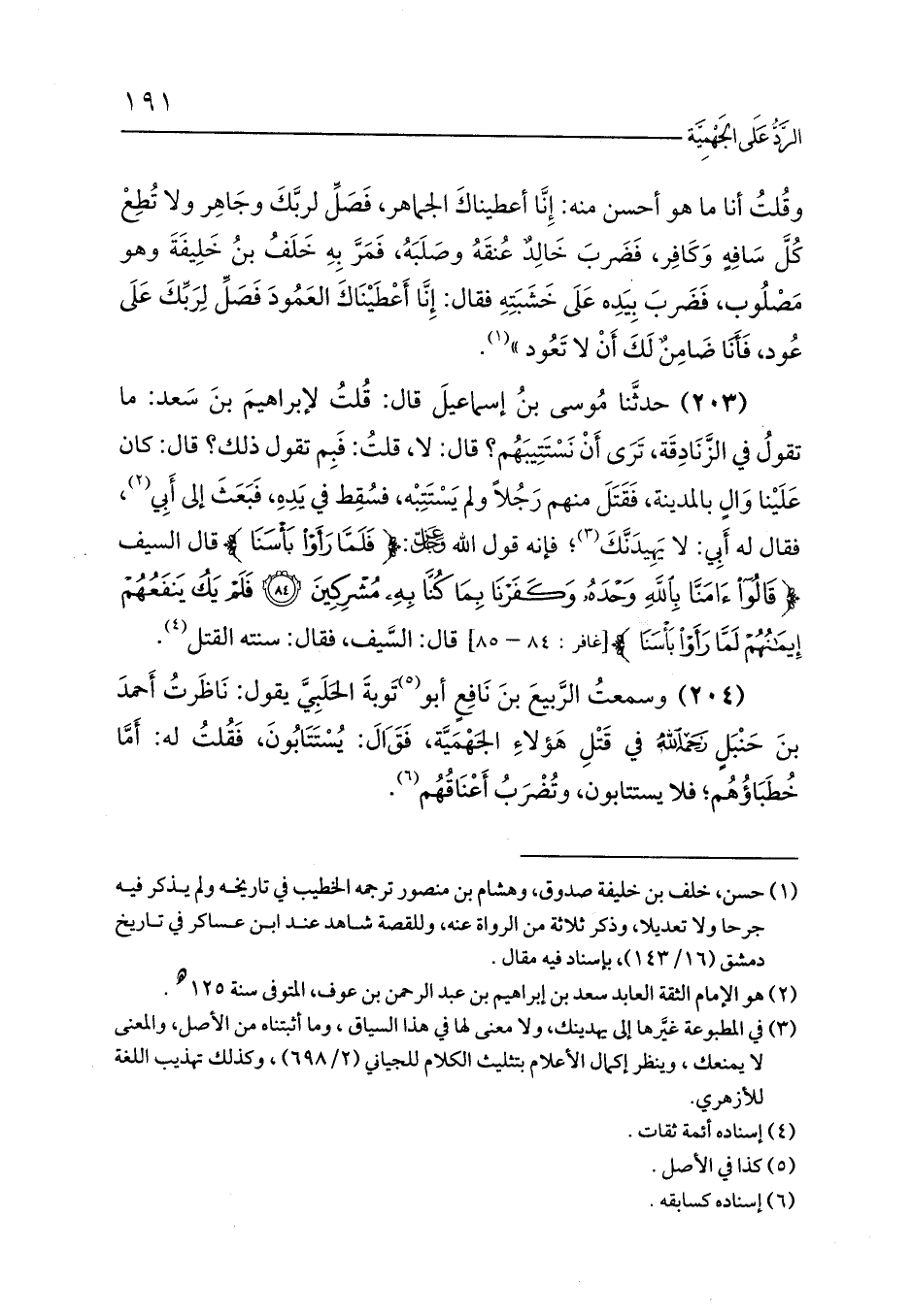 (203) حدثَّنا مُوسى بنُ إسماعيلَ قال: قُلتُ لإبراهيمَ بنَ سَعد: ما تقولُ في الزَّنَادِقَة، تَرَى أَنْ نَسْتَتِيبَهُم؟ قال: لا، قلتُ: فَبِم تقول ذلك؟ قال: كان عَلَيْنا وَالٍ بالمدينة، فَقَتَلَ منهم رَجُلاً ولم يَسْتَتِبْه، فسُقِط في يَدِهِ، فَبَعَثَ إلى أَبِي (¬2)، فقال له أَبِي: لا يَهِيدَنَّكَ (¬3)؛ فإنه قول الله - عز وجل -: {فَلَمَّا رَأَوْا بَأْسَنَا} قال السيف {قَالُوا آمَنَّا بِاللَّهِ وَحْدَهُ وَكَفَرْنَا بِمَا كُنَّا بِهِ مُشْرِكِينَ (84) فَلَمْ يَكُ يَنْفَعُهُمْ إِيمَانُهُمْ لَمَّا رَأَوْا بَأْسَنَا} [غافر: 84 - 85] قال: السَّيف، فقال: سنته القتل (¬4).
