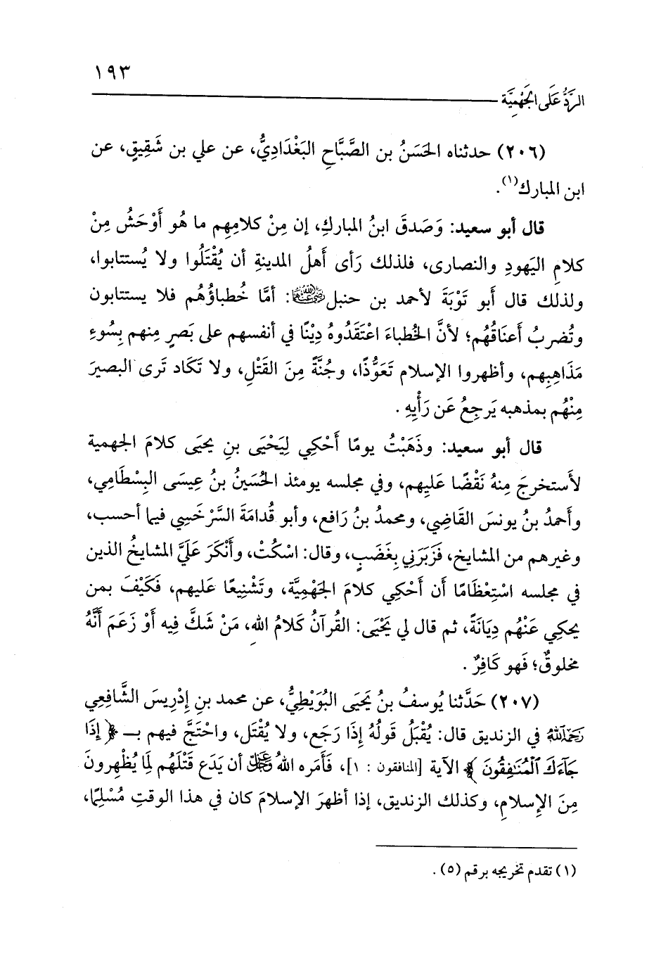 (207) حَدَّثنا يُوسفُ بنُ يَحيَى البُوَيْطِيُّ، عن محمد بنِ إِدْرِيسَ الشَّافِعِي في الزنديق قال: يُقْبَلُ قَولُهُ إِذَا رَجَع، ولا يُقْتَل، واحْتَجَّ فيهم بـ {إِذَا جَاءَكَ الْمُنَافِقُونَ} الآية [المنافقون: 1]، فَأَمَره اللهُ - عز وجل - أن يَدَع قَتْلَهُم لِمَا يُظْهِرونَ مِنَ الإِسلامِ، وكذلك الزنديق، إذا أظهرَ الإسلامَ كان في هذا الوقتِ مُسْلِمًا،