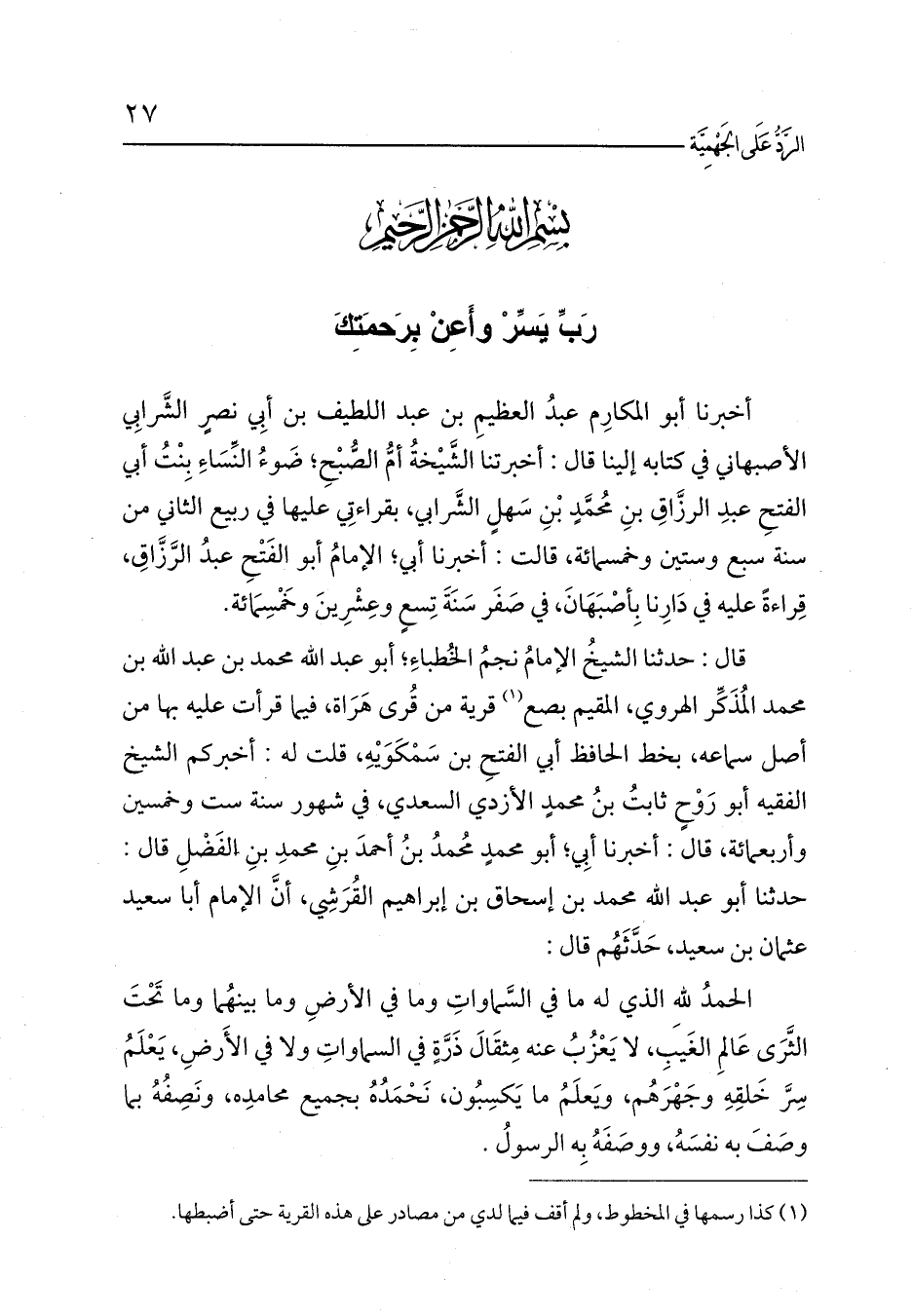 قال: حدثنا الشيخُ الإمامُ نجمُ الخُطباءِ؛ أبو عبد الله محمد بن عبد الله بن محمد المُذَكِّر الهروي، المقيم بصع (¬1) قرية من قُرى هَرَاة، فيما قرأت عليه بها من أصل سماعه، بخط الحافظ أبي الفتحِ بن سَمْكَوَيْهِ، قلت له: أخبركم الشيخ الفقيه أبو رَوْحٍ ثابتُ بنُ محمدٍ الأزدي السعدي، في شهور سنة ست وخمسين وأربعمائة، قال: أخبرنا أبِي؛ أبو محمدٍ مُحمدُ بنُ أحمدَ بنِ محمدِ بنِ الفَضْلِ قال: حدثنا أبو عبد الله محمد بن إسحاق بن إبراهيم القُرَشِي، أنَّ الإمام أبا سعيد عثمان بن سعيد، حَدَّثَهُم قال: