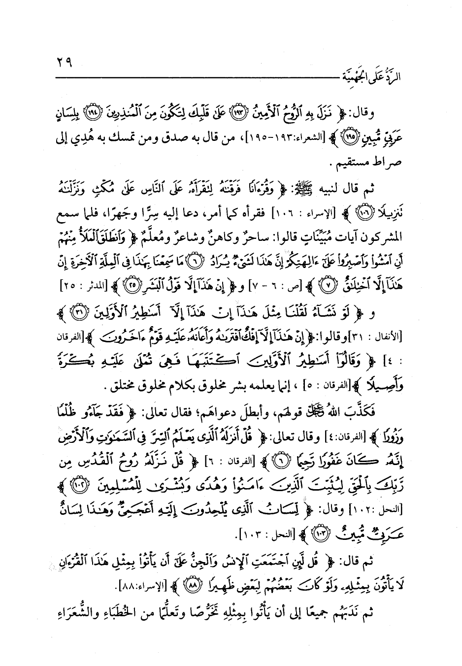 وقال: {نَزَلَ بِهِ الرُّوحُ الْأَمِينُ (193) عَلَى قَلْبِكَ لِتَكُونَ مِنَ الْمُنْذِرِينَ (194) بِلِسَانٍ عَرَبِيٍّ مُبِينٍ (195)} [الشعراء:193 - 195]، من قال به صدق ومن تمسك به هُدِي إلى صراط مستقيم. ثم قال لنبيه - صلى الله عليه وسلم -: {وَقُرْآنًا فَرَقْنَاهُ لِتَقْرَأَهُ عَلَى النَّاسِ عَلَى مُكْثٍ وَنَزَّلْنَاهُ تَنْزِيلًا (106)} [الإسراء: 106] فقرأه كما أمر، دعا إليه سِرًّا وجَهرًا، فلما سمع المشركون آيات مُبَيِّنَاتٍ قالوا: ساحرٌ وكاهنٌ وشاعرٌ ومُعلَّمٌ {وَانْطَلَقَ الْمَلَأُ مِنْهُمْ أَنِ امْشُوا وَاصْبِرُوا عَلَى آلِهَتِكُمْ إِنَّ هَذَا لَشَيْءٌ يُرَادُ (6) مَا سَمِعْنَا بِهَذَا فِي الْمِلَّةِ الْآخِرَةِ إِنْ هَذَا إِلَّا اخْتِلَاقٌ (7)} [ص: 6 - 7] و {إِنْ هَذَا إِلَّا قَوْلُ الْبَشَرِ (25)} [المدثر: 25]