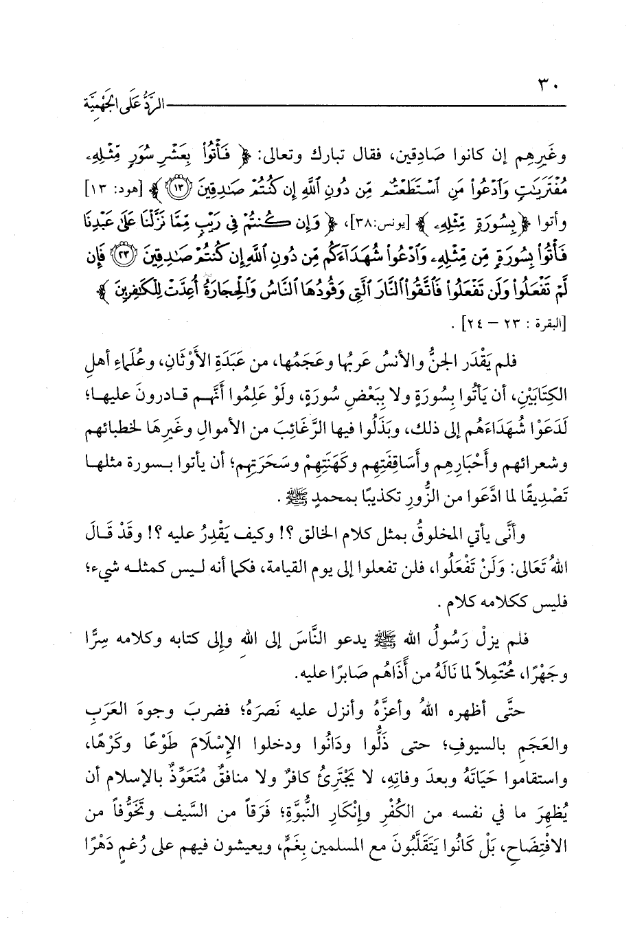 فلم يَقْدَر الجنُّ والأنسُ عَربُها وعَجَمُها، من عَبَدَةِ الأَوْثَانِ، وعُلَماءِ أهلِ الكِتَابَيْنِ، أن يَأتُوا بِسُورَةٍ ولا بِبَعْضِ سُورَةٍ، ولَوْ عَلِمُوا أَنَّهم قادرونَ عليها؛ لَدَعَوْا شُهَدَاءَهُم إلى ذلك، وبَذَلُوا فيها الرَّغَائِبَ من الأموالِ وغَيرِهَا لخطبائهم وشعرائهم وأَحْبَارِهِم وأَسَاقِفَتِهِم وكَهَنَتِهِمْ وسَحَرَتِهِم؛ أن يأتوا بسورة مثلها تَصْدِيقًا لما ادَّعَوا من الزُّورِ تكذيبًا بمحمدٍ - صلى الله عليه وسلم -.