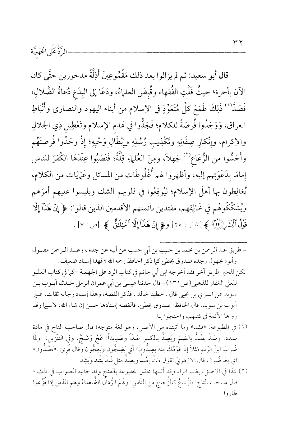 قال أبو سعيد: ثم لم يزالوا بعد ذلك مَقْمُوعِينَ أَذِلَّةً مدحورين حتَّى كان الآن بأخرة؛ حيثُ قَلَّتِ الفُقهاء وقُبِضَ العلماءُ، ودَعَا إلى البِدَعِ دُعاةُ الضَّلالِ؛ فَصَدَّ (¬1) ذَلِكَ طَمَعَ كلِّ مُتَعَوِّذٍ في الإسلام من أبناء اليهود والنصارى وأَنْبَاطِ العراق، وَوَجَدُوا فُرصَةً للكلام؛ فَجَدُّوا في هَدمِ الإسلام وتَعْطِيلِ ذِي الجلالِ والإكرام، وإِنْكارِ صِفَاتِهِ وتَكْذِيبِ رُسُلِهِ وإِبْطَالِ وَحْيِهِ؛ إِذْ وجَدُوا فُرصتَهُم وأَحَسُّوا من الرُّعَاعِ (¬2) جَهلاً، ومِنَ العُلماءِ قِلَّةً؛ فَنَصَبُوا عِنْدَهَا الكُفرَ للناس إِمامًا بِدَعْوَتِهم إليه، وأظهروا لهم أُغْلُوطَات من المسائل وعَمَايَات من الكلام، يُغالِطون بها أهلَ الإسلام؛ ليُوقِعُوا في قلوبهم الشك ويلبسوا عليهم أمرَهم ويُشَكِّكُوهُم في خَالِقِهم، مقتدين بأئمتهم الأقدمين الذين قالوا: {إِنْ هَذَا إِلَّا قَوْلُ الْبَشَرِ (25)} [المدثر: 25] و {إِنْ هَذَا إِلَّا اخْتِلَاقٌ} [ص: 7].