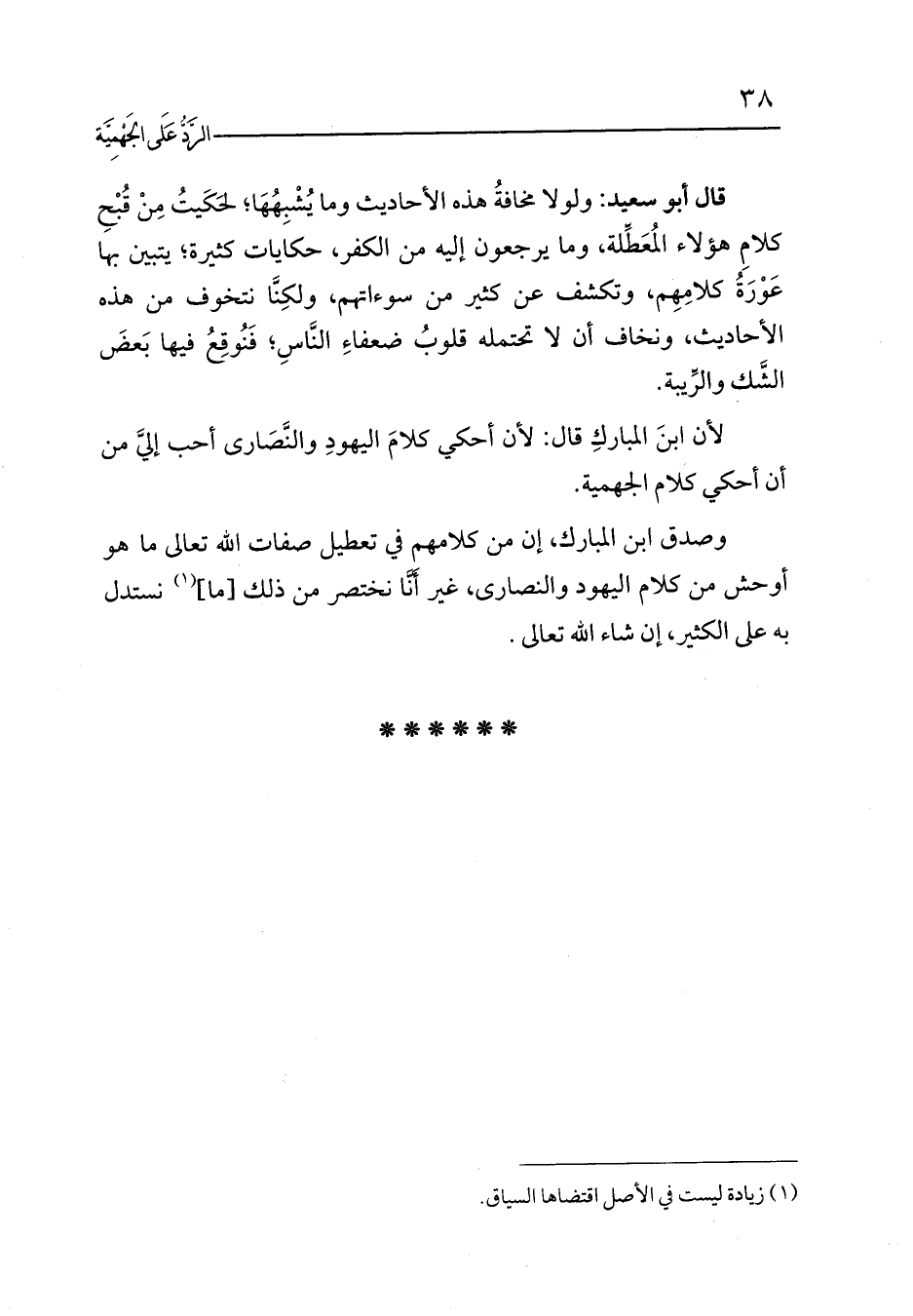 قال أبو سعيد: ولولا مخافةُ هذه الأحاديث وما يُشْبِهُهَا؛ لحَكَيتُ مِنْ قُبْحِ كلامِ هؤلاء المُعَطِّلة، وما يرجعون إليه من الكفر، حكايات كثيرة؛ يتبين بها عَوْرَةُ كلامِهِم، وتكشف عن كثير من سوءاتهم، ولكِنَّا نتخوف من هذه الأحاديث، ونخاف أن لا تحتمله قلوبُ ضعفاءِ النَّاسِ؛ فَنُوقِعُ فيها بَعضَ الشَّك والرِّيبة.