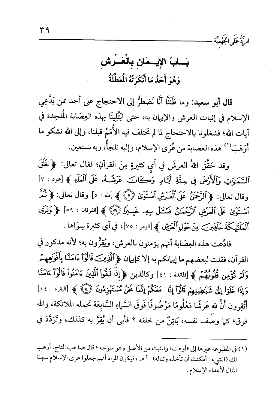 قال أبو سعيد: وما ظَنَنَّا أنَّا نَضطرُّ إلى الاحتجاج على أحد ممن يَدَّعِي الإسلام في إثبات العرش والإيمان به، حتى ابْتُلِينَا بهذه العِصَابة المُلحِدة في آيات الله؛ فشغلونا بالاحتجاج لما لم تختلف فيه الأُمَمُ قبلنا، وإلى الله نشكو ما أَوْهَبَ (¬1) هذه العصابة من عُرَى الإسلام، وإليه نلجأُ، وبه نستعين.