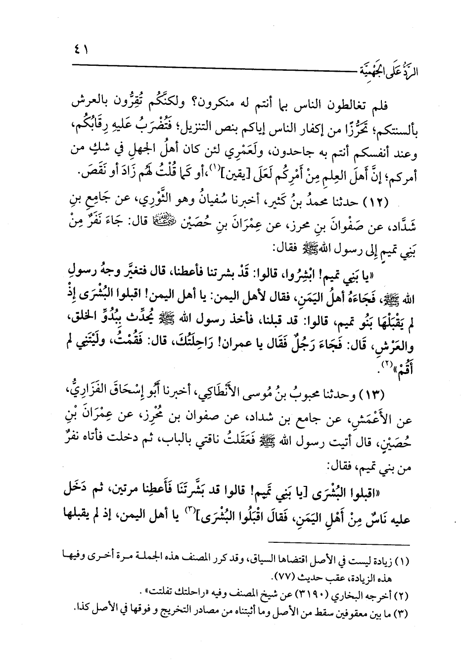 (13) وحدثنا محبوبُ بنُ مُوسى الأَنْطَاكِي، أخبرنا أَبُو إِسْحَاقَ الفَزَارِيُّ، عن الأَعْمَشِ، عن جامع بن شداد، عن صفوان بن مُحْرِز، عن عِمْرَانَ بْنِ حُصَيْنٍ، قال أتيت رسول الله - صلى الله عليه وسلم - فَعَقَلتُ ناقتي بالباب، ثم دخلت فأتاه نفرٌ من بني تميم، فقال: