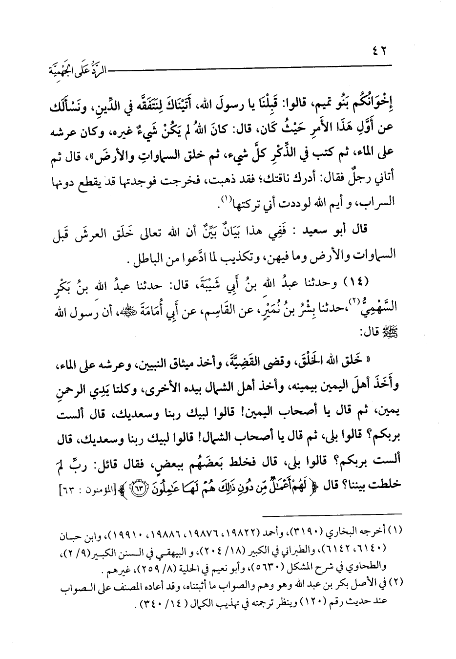 إِخْوَانُكُم بَنُو تميم، قالوا: قَبِلْنَا يا رسولَ الله، أَتَيْنَاكَ لِنَتَفَقَّه في الدِّينِ، ونَسْأَلَك عن أَوَّلِ هَذَا الأَمرِ حَيْثُ كَان، قال: كانَ اللهُ لم يَكُنْ شَيءٌ غيره، وكان عرشه على الماء، ثم كتب في الذِّكْرِ كلَّ شيء، ثم خلق السماواتِ والأرضَ»، قال ثم أتاني رجلٌ فقال: أدرك ناقتك؛ فقد ذهبت، فخرجت فوجدتها قد يقطع دونها السراب، وأيم الله لوددت أني تركتها (¬1).
