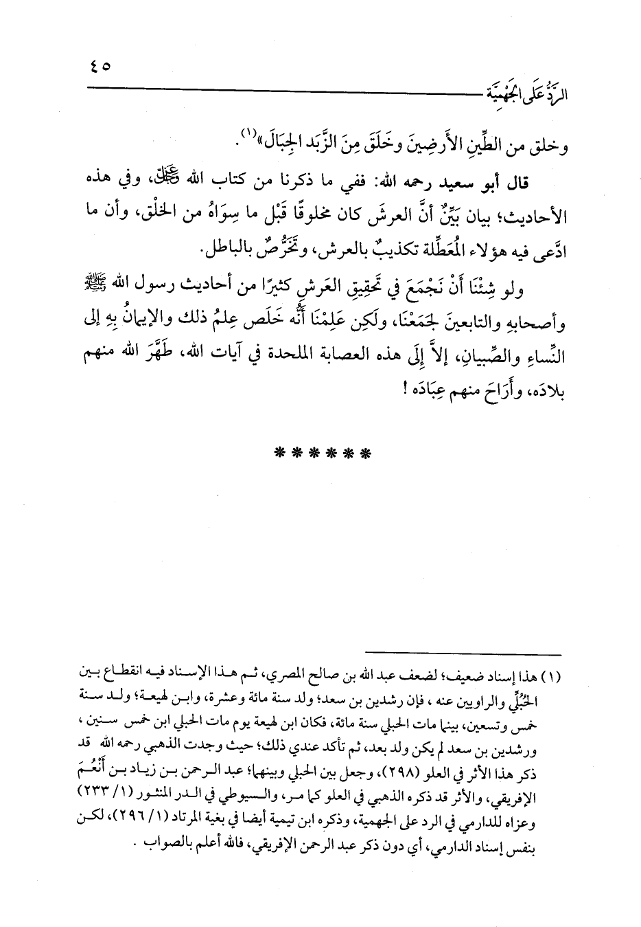 ولو شِئْنَا أَنْ نَجْمَعَ في تَحقِيقِ العَرشِ كثيرًا من أحاديث رسول الله - صلى الله عليه وسلم - وأصحابهِ والتابعينَ لجَمَعْنَا، ولَكِن عَلِمْنَا أَنُّه خَلَص عِلمُ ذلك والإيمانُ بِهِ إلى النِّساءِ والصِّبيانِ، إلاَّ إِلَى هذه العصابة الملحدة في آيات الله، طَهَّرَ الله منهم بلادَه، وأَرَاحَ منهم عِبَادَه!