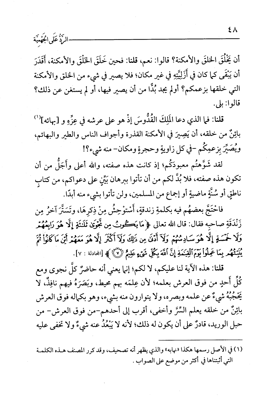 أن يَخْلُقَ الخلقَ والأمكنة؟ قالوا: نعم، قلنا: فحين خَلَقَ الخَلْقَ والأمكنة، أَقَدَرَ أن يَبْقَى كما كان في أَزَلِيَّتِهِ في غير مكان؛ فلا يصير في شيء من الخلق والأمكنة التي خلقها بزعمكم؟ أولم يجد بُدًّا من أن يصير فيها، أو لم يستغن عن ذلك؟ قالوا: بلى.