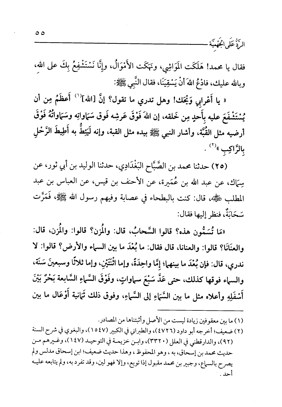 (¬2) ضعيف؛ أخرجه أبو داود (4726)، والطبراني في الكبير (1547)، والبغوي في شرح السنة (92)، والدارقطني في العلل (3320)، وابن خزيمة في التوحيد (147)، وغيرهم من حديث محمد بن إسحاق، به، وهو المحفوظ، وهذا حديث ضعيف؛ ابن إسحاق مدلس ولم يصرح بالسماع، وجبير بن محمد مقبول إذا توبع، وإلا فهو لين، وقد تفرد به، ولم يتابعه عليه أحد.