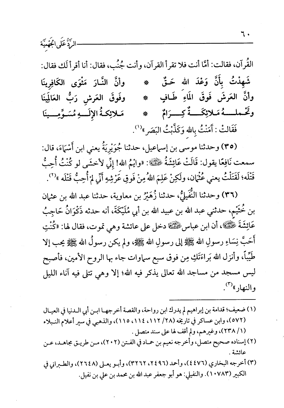 (36) وحدثنا النُّفَيليُّ، حدثنا زُهَيْرُ بن معاوية، حدثنا عبد الله بن عثمان بن خُثَيْمٍ، حدثني عبد الله بن عبيد الله بن أبي مُلَيْكَةَ، أنه حدثه ذَكْوَانُ حَاجِبُ عَائِشَةَ - رضي الله عنها -، أن ابن عباس? دخل على عائشة وهي تموت، فقال لها: «كُنْتِ أَحَبَّ نِسَاءِ رسولِ الله - صلى الله عليه وسلم - إلى رسولِ الله - صلى الله عليه وسلم -، ولم يكن رسولُ الله - صلى الله عليه وسلم - يحب إلا طَيِّباً، وأنزل الله بَراءَتَكِ مِن فوق سبع سماوات جاء بها الروح الأمين، فأصبح ليس مسجد من مساجد الله تعالى يذكر فيه الله؛ إلا وهي تتلى فيه آناء الليل والنهار» (¬3).