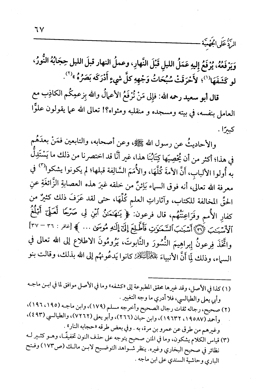 قال أبو سعيد رحمه الله: فإِلى مَنْ تُرْفَعُ الأعمالُ والله بِزعمِكُم الكاذِب مع العامل بنفسه، في بيته ومسجده ومنقلبه ومثواه؟! تعالى الله عما يقولون علوًّا كبيرًا.