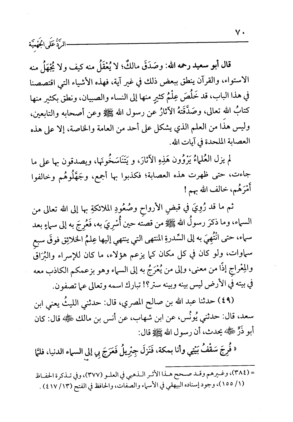 ثم ما قد رُوِيَ في قبضِ الأرواحِ وصُعُودِ الملائكةِ بها إلى الله تعالى من السماء، وما ذكرَ رسولُ الله - صلى الله عليه وسلم - من قصته حين أُسْرِيَ به، فَعُرِجَ به إلى سماءٍ بعد سماء، حتى انْتُهِيَ به إلى السِّدرةِ المنتهى التي ينتهي إليها عِلمُ الخلائِق فوقَ سبعِ سماوات، ولو كان في كل مكان كما يزعم هؤلاء، ما كان للإسراء والبُرَاق والمِعْراجِ إذًا من معنى، وإلى من يُعْرَجُ به إلى السماء وهو بزعمكم الكاذب معه في بيته في الأرض ليس بينه وبينه ستر؟! تبارك اسمه وتعالى عما تصفون.