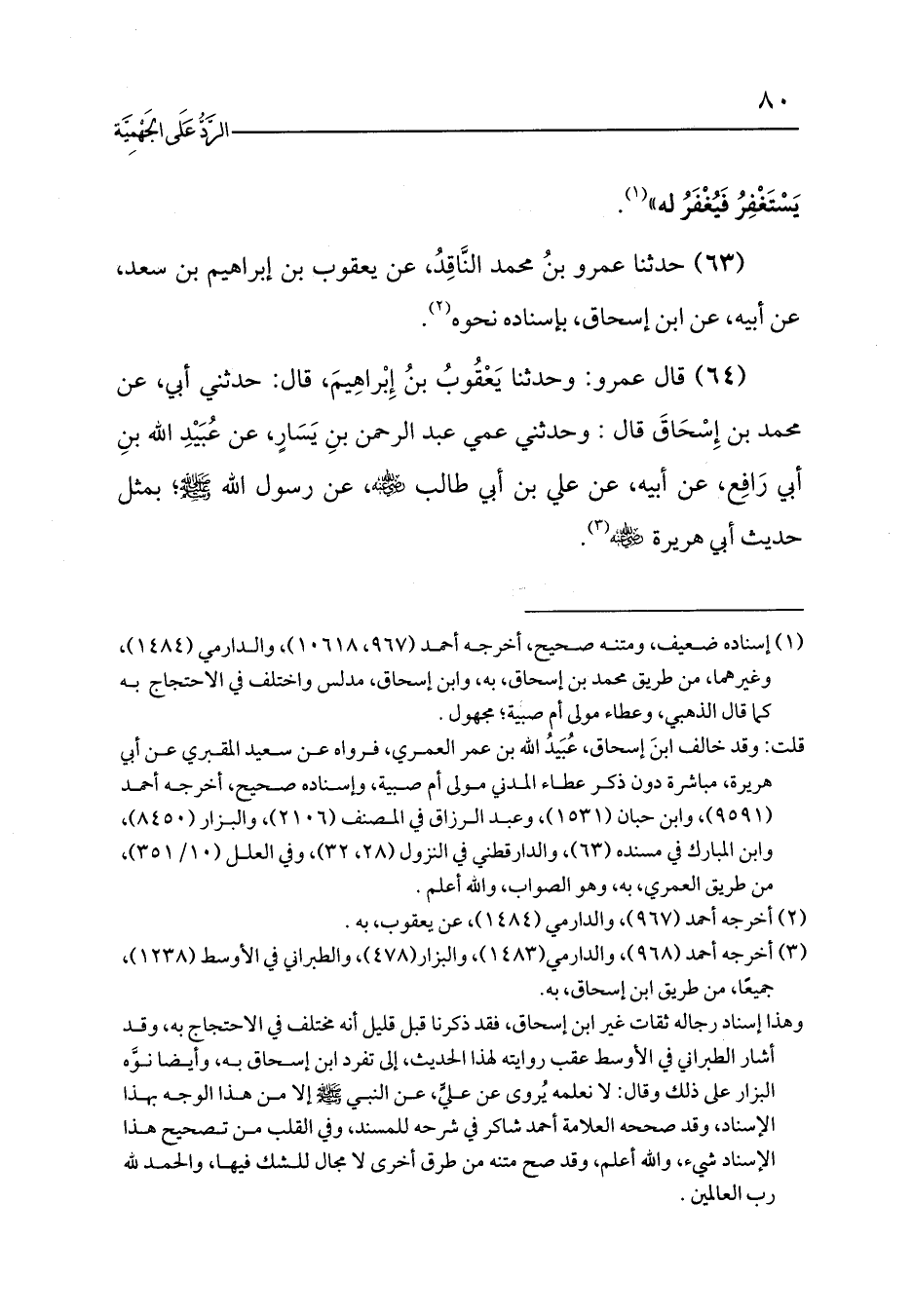 (64) قال عمرو: وحدثنا يَعْقُوبُ بنُ إِبْراهِيمَ، قال: حدثني أبي، عن محمد بن إِسْحَاقَ قال: وحدثني عمي عبد الرحمن بنِ يَسَارٍ، عن عُبَيْدِ الله بنِ أبي رَافِع، عن أبيه، عن علي بن أبي طالب - رضي الله عنه -، عن رسول الله - صلى الله عليه وسلم -؛ بمثل حديث أبي هريرة - رضي الله عنه - (¬3).