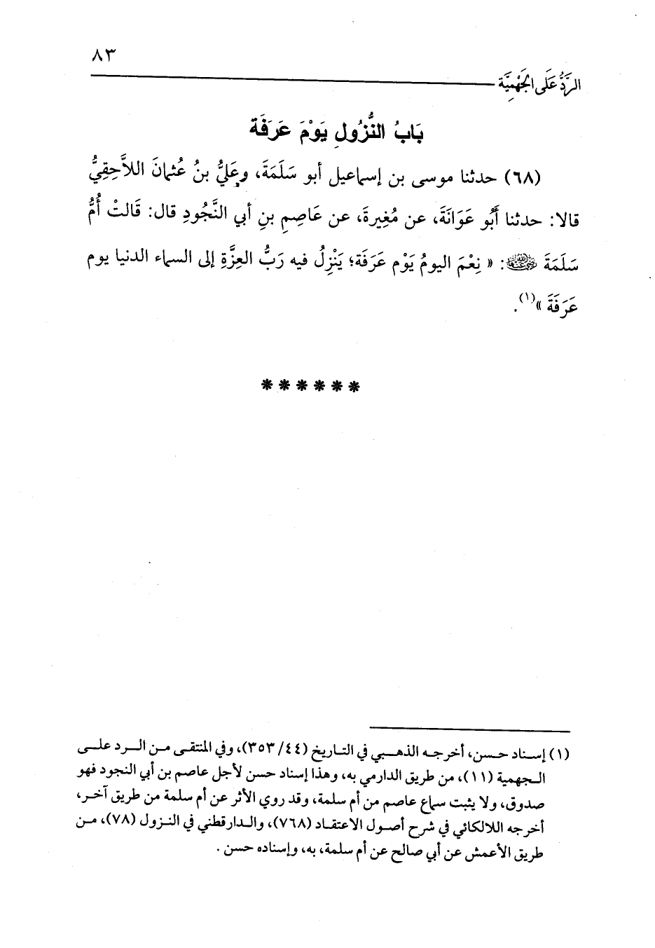 (68) حدثنا موسى بن إسماعيل أبو سَلَمَةَ، وعَليُّ بنُ عُثمانَ اللاَّحِقِيُّ قالا: حدثنا أَبُو عَوَانَةَ، عن مُغِيرةَ، عن عَاصِمِ بنِ أبي النَّجُودِ قال: قَالتْ أُمُّ سَلَمَةَ - رضي الله عنها -: «نِعْمَ اليومُ يَوْم عَرَفَة؛ يَنْزِلُ فيه رَبُّ العِزَّةِ إلى السماء الدنيا يوم عَرَفَةَ» (¬1).