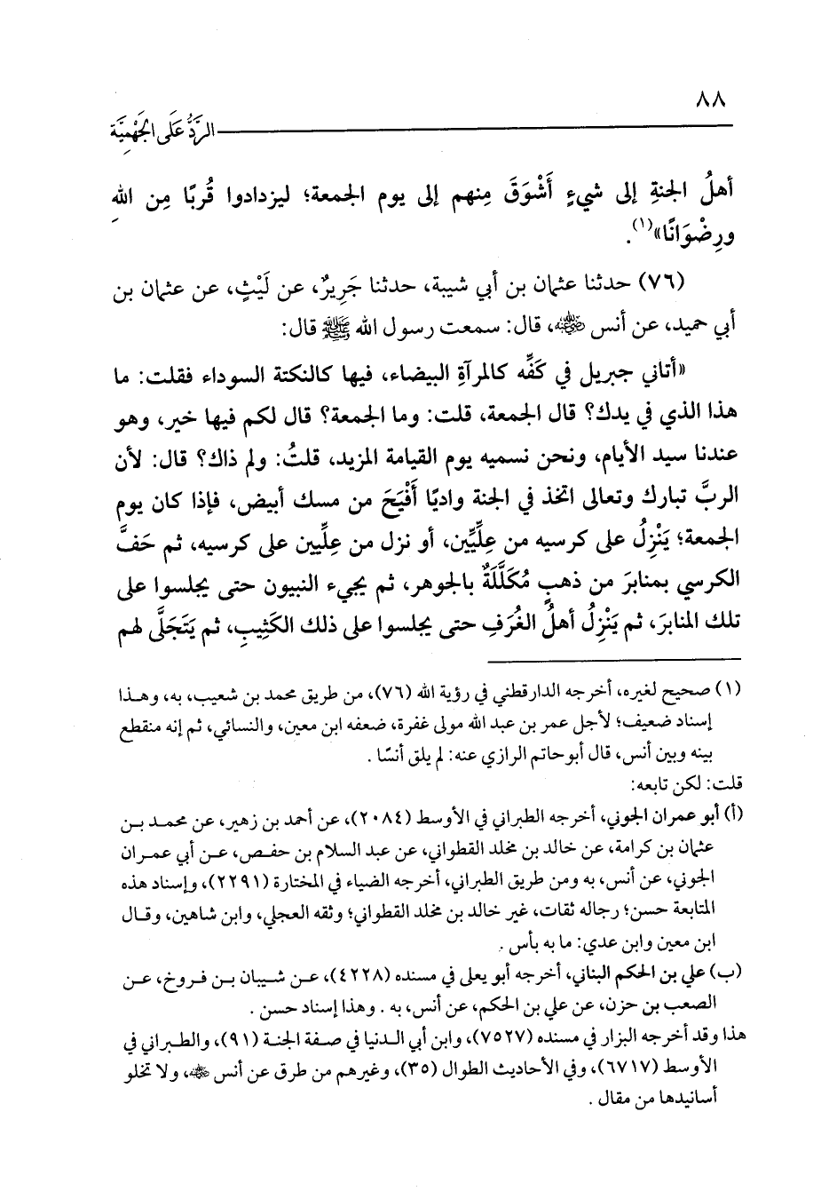 «أتاني جبريل في كَفِّه كالمرآةِ البيضاء، فيها كالنكتة السوداء فقلت: ما هذا الذي في يدك؟ قال الجمعة، قلت: وما الجمعة؟ قال لكم فيها خير، وهو عندنا سيد الأيام، ونحن نسميه يوم القيامة المزيد، قلتُ: ولم ذاك؟ قال: لأن الربَّ تبارك وتعالى اتخذ في الجنة واديًا أَفْيَحَ من مسك أبيض، فإذا كان يوم الجمعة؛ يَنْزِلُ على كرسيه من عِلِّيِّين، أو نزل من عِلِّيين على كرسيه، ثم حَفَّ الكرسي بمنابرَ من ذهبٍ مُكَلَّلَةٌ بالجوهر، ثم يجيء النبيون حتى يجلسوا على تلك المنابرَ، ثم يَنْزِلُ أهلُ الغُرَفِ حتى يجلسوا على ذلك الكَثِيبِ، ثم يَتَجَلَّى لهم