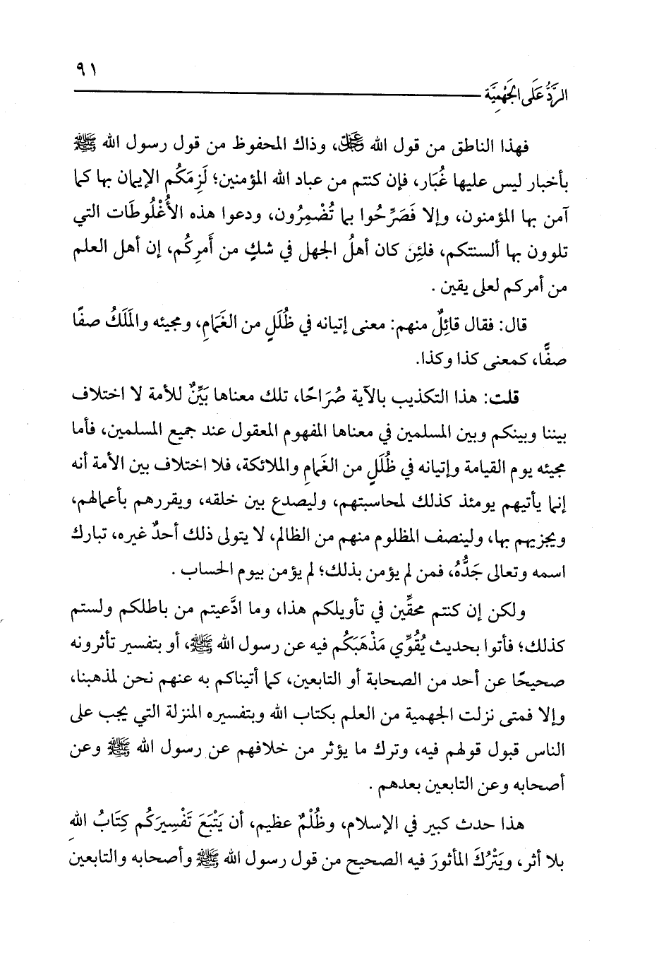 ولكن إن كنتم محقِّين في تأويلكم هذا، وما ادَّعيتم من باطلكم ولستم كذلك؛ فأتوا بحديث يُقُوِّي مَذْهَبَكُم فيه عن رسول الله - صلى الله عليه وسلم -، أو بتفسير تأثرونه صحيحًا عن أحد من الصحابة أو التابعين، كما أتيناكم به عنهم نحن لمذهبنا، وإلا فمتى نزلت الجهمية من العلم بكتاب الله وبتفسيره المنزلة التي يجب على الناس قبول قولهم فيه، وترك ما يؤثر من خلافهم عن رسول الله - صلى الله عليه وسلم - وعن أصحابه وعن التابعين بعدهم.