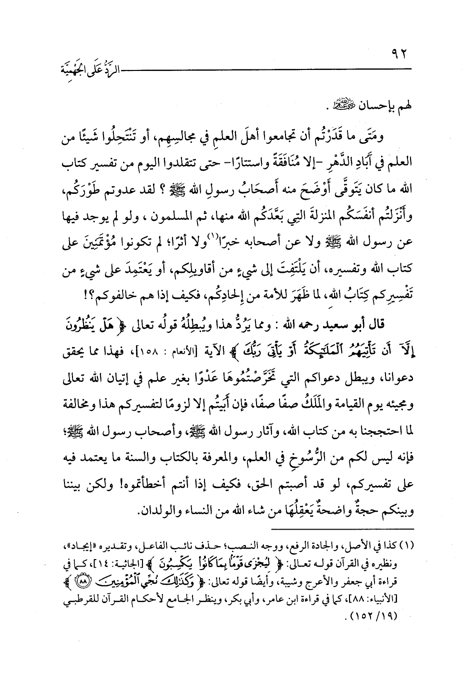 قال أبو سعيد رحمه الله: ومما يَرُدُّ هذا ويُبطِلُهُ قولُه تعالى {هَلْ يَنْظُرُونَ إِلَّا أَنْ تَأْتِيَهُمُ الْمَلَائِكَةُ أَوْ يَأْتِيَ رَبُّكَ} الآية [الأنعام: 158]، فهذا مما يحقق دعوانا، ويبطل دعواكم التي تَخَرَّصْتُمُوهَا عَدْوًا بغير علم في إتيان الله تعالى ومجيئه يوم القيامة والمَلَكُ صفًا صفًا، فإن أَبَيتُم إلا لزومًا لتفسيركم هذا ومخالفة لما احتججنا به من كتاب الله، وآثار رسول الله - صلى الله عليه وسلم -، وأصحاب رسول الله - صلى الله عليه وسلم -؛ فإنه ليس لكم من الرُّسُوخِ في العلم، والمعرفة بالكتاب والسنة ما يعتمد فيه على تفسيركم، لو قد أصبتم الحق، فكيف إذا أنتم أخطأتموه! ولكن بيننا وبينكم حجةٌ واضحةٌ يَعْقِلُهَا من شاء الله من النساء والولدان.